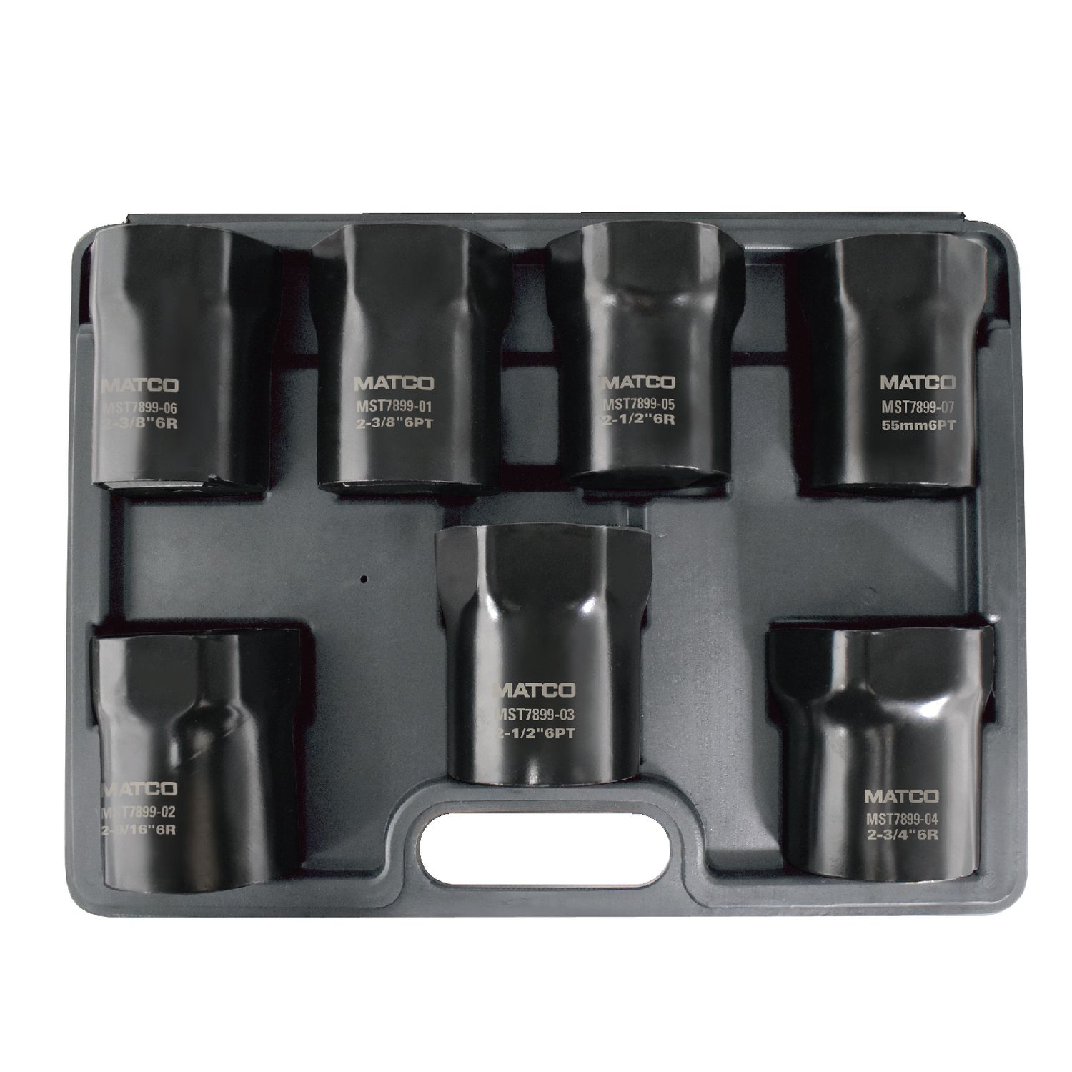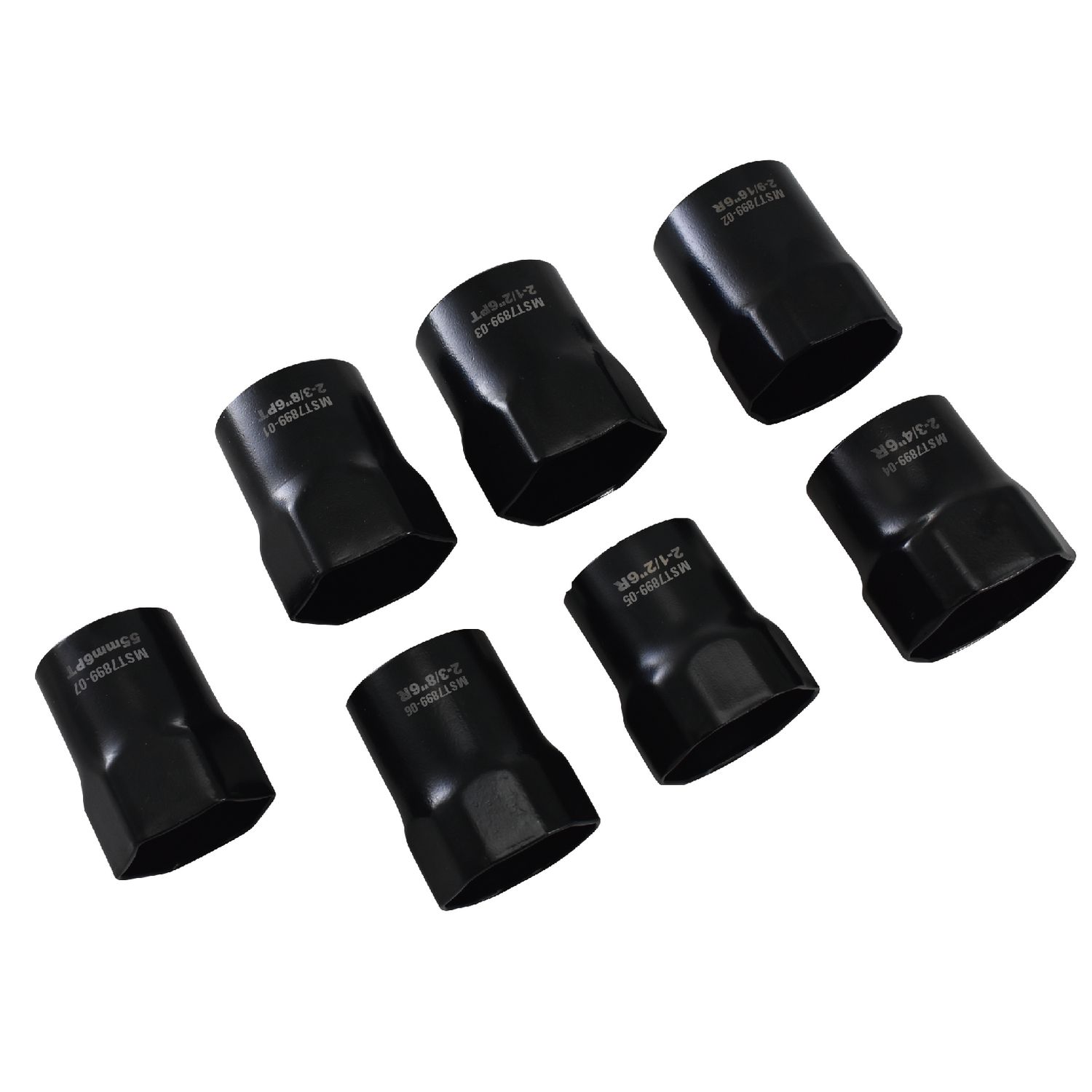 Set includes 55mm hex, 2-3/8\” rounded hex, 2-3/8\” hex, 2-1/2\” rounded hex, 2-1/2\” hex, 2-9/16\” rounded hex and 2-3/4\” rounded hex
