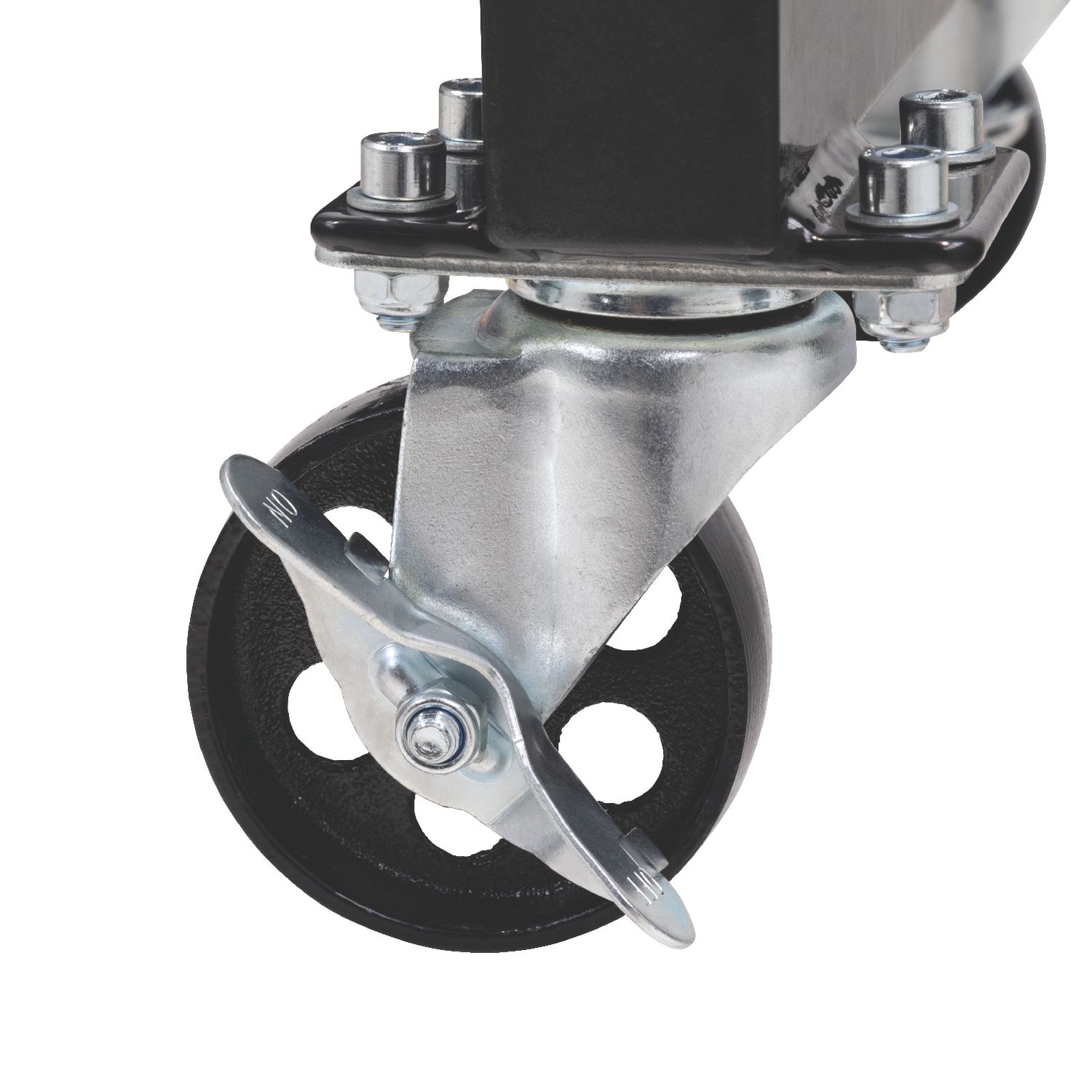 Ball bearing mounted swivel caster wheels for easy maneuvering include locks to prevent stand from moving
