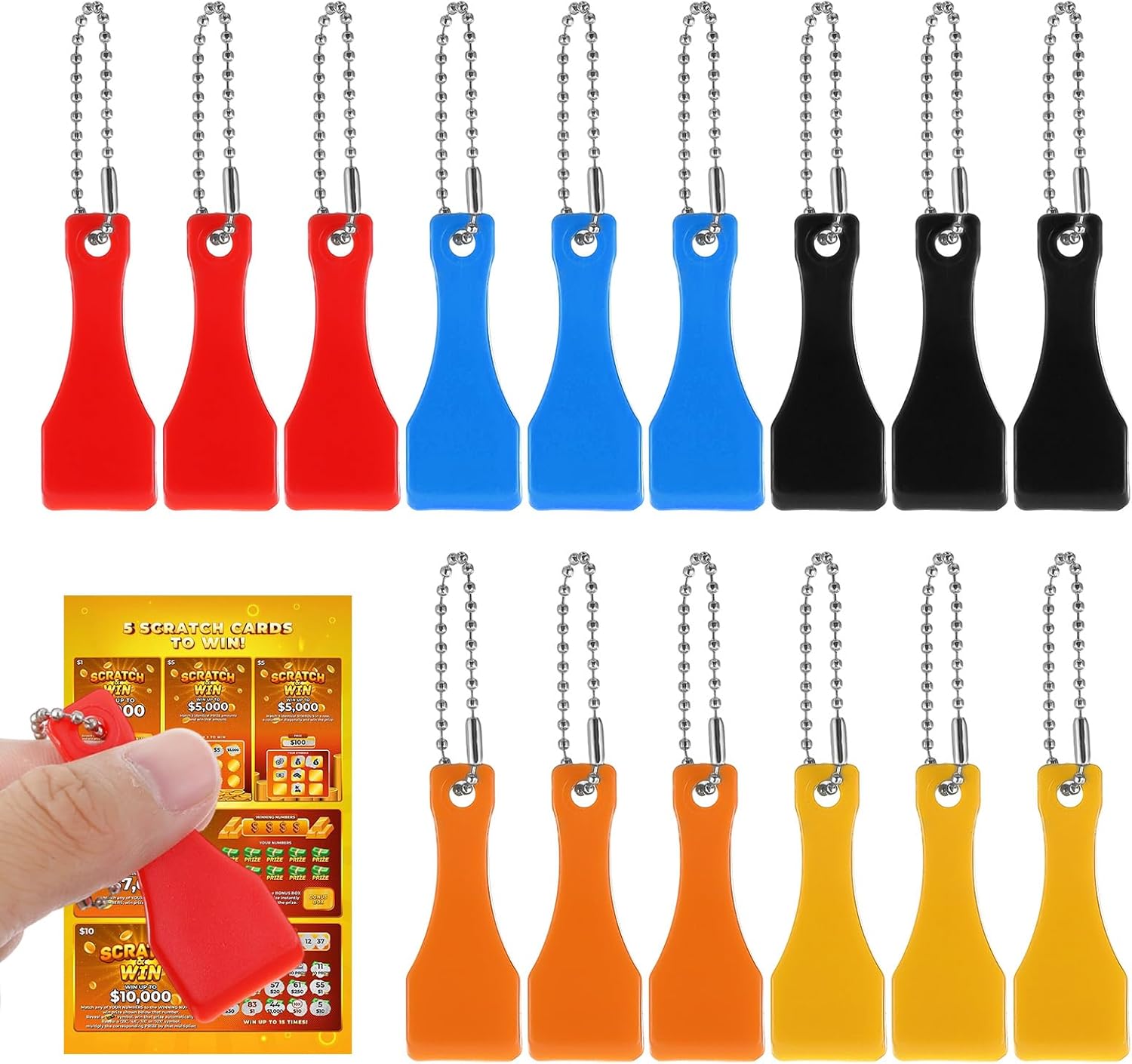 【Package Inclusion】: You will receive a total of 15PCS of lottery ticket scratcher tool keychains, including 3PCS blue, 3PCS yellow, 3PCS red, 3PCS orange, and 3PCS black scratchers. The lotto scratcher tool has a portable size of 9cm/3.5in (with chain) and 5.7×2.2cm/2.2×0.9in (without chain)
