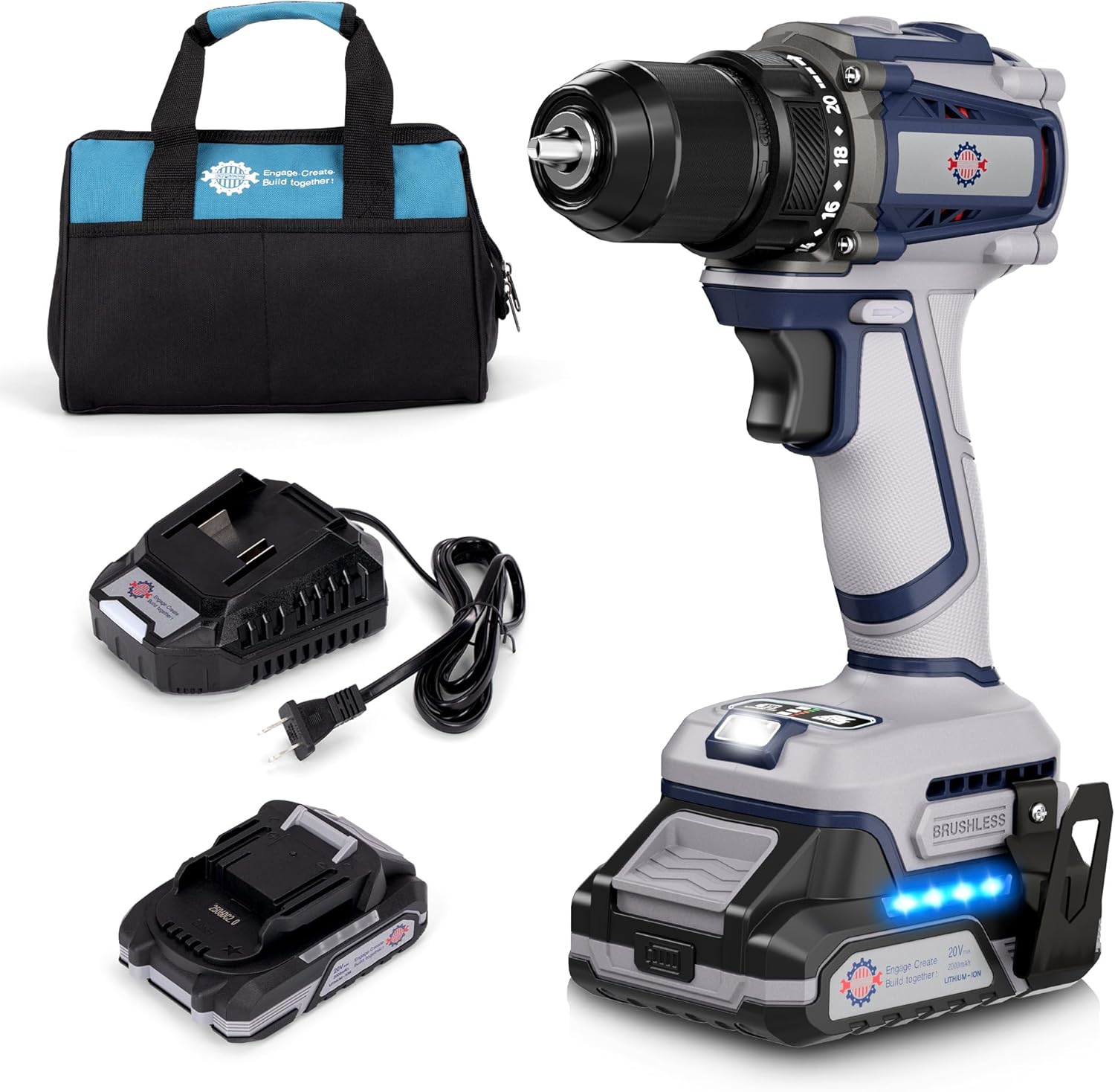 【Powerful 70Nm Max Torque & 20+1 Clutch Settings】 Engineered with a advanced brushless motor, this electric drill delivers an exceptional 70 N.m (620 in-lbs) of torque, effortlessly tackling heavy-duty applications. With 20+1 precise torque settings, you gain superior control over penetration depth and operational accuracy. Whether drilling through tough materials or driving screws, achieve higher efficiency and flawless results every time.