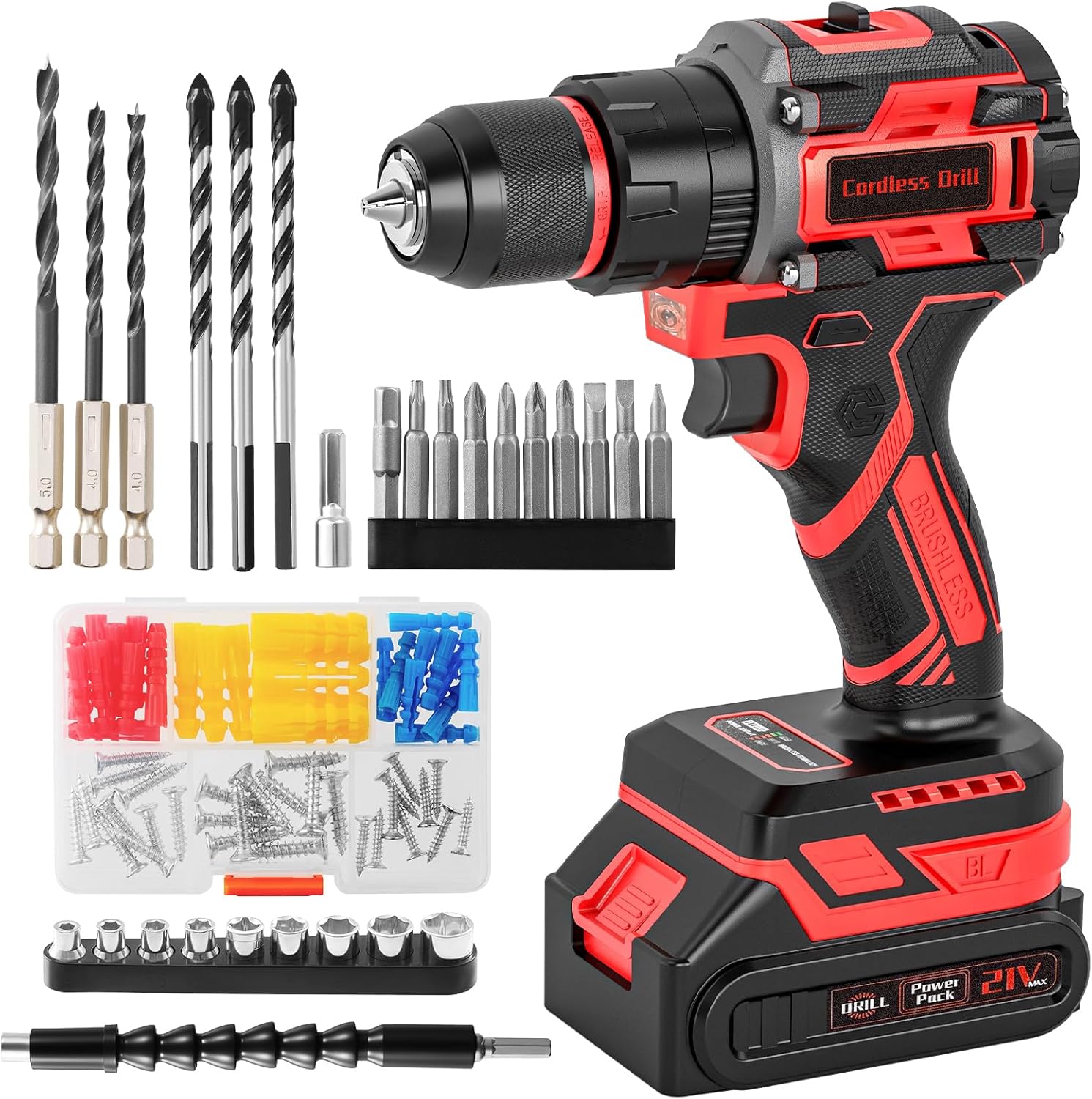 87PCS accessory set & 10mm heavy-duty self-locking chuck: 3x Wood drill bits; 3x Masonry Drill Bit; 9x screwdriver bits; 1x socket adapter; 1x screwdriver bit extension; 9x sockets; 60x Screw anchor set; 1x flexible shaft; paired with a 10mm metal heavy-duty self-locking chuck, providing a more stable feel and a better user experience during work.