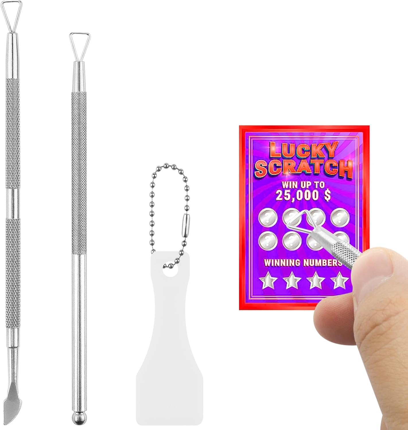 Comprehensive Set: This complete lottery ticket scratcher tool set includes three different styles: one blade tip for precise scratching, one ball bead tip for smooth coverage, and one plastic scraper tool for versatile use. With multiple tool options, you’ll have the perfect scratch off tool for any type of lottery ticket or scratch card.