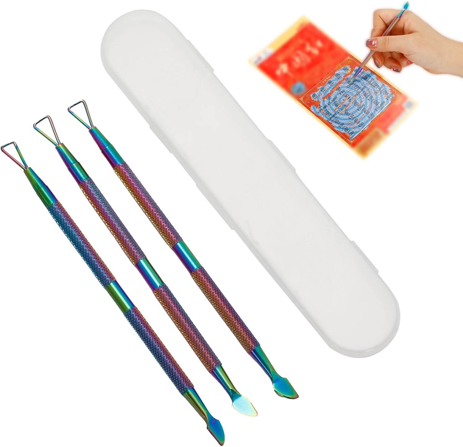 The set includes 3 colorful gradient scratch tools, great for ordinary use and sharing with friends and family. All tools come conveniently stored in a compact box, making them easy to store and carry. Say goodbye to using coins or fingernails and experience the ease and convenience of the 3 Pcs Metal Lottery Scratcher Tool.