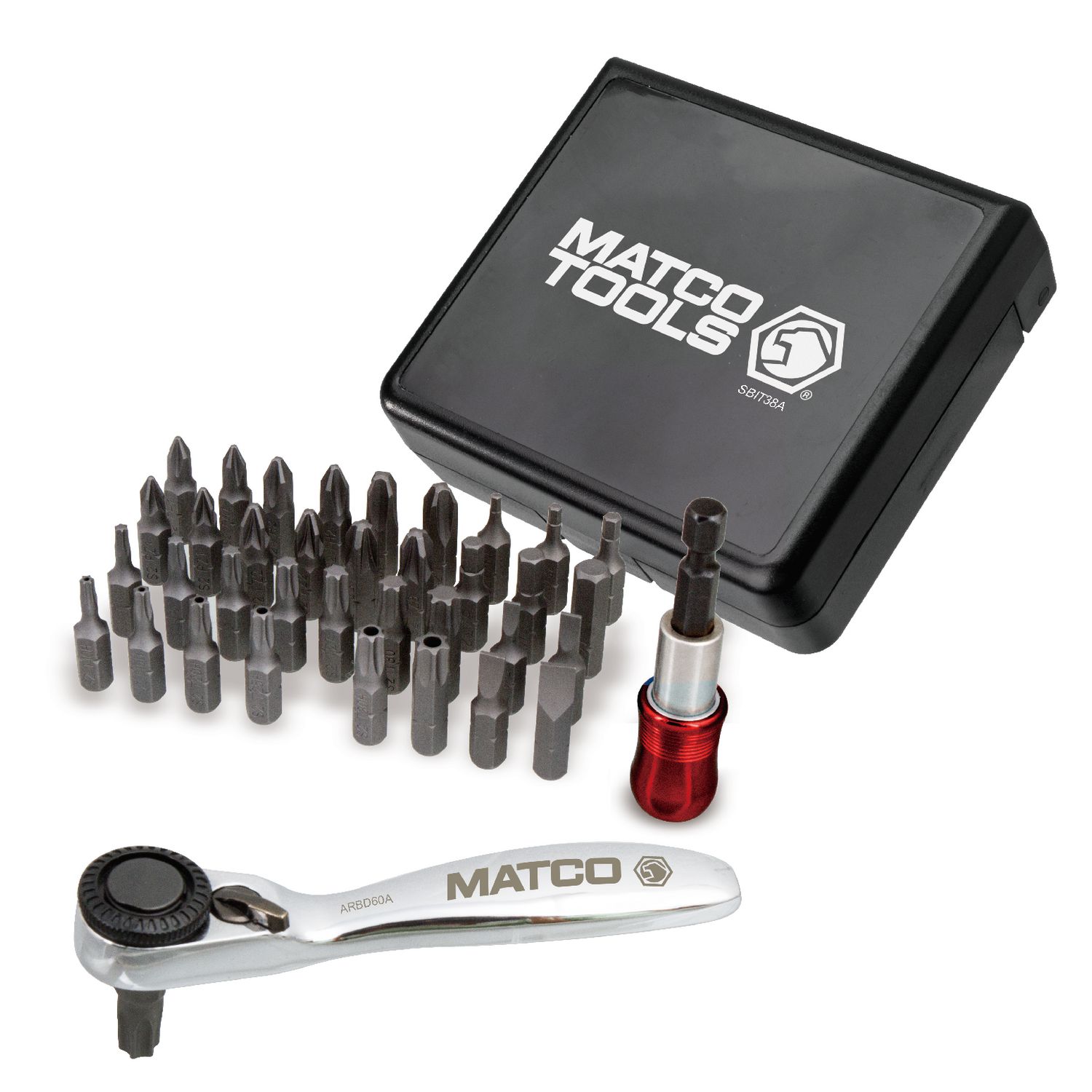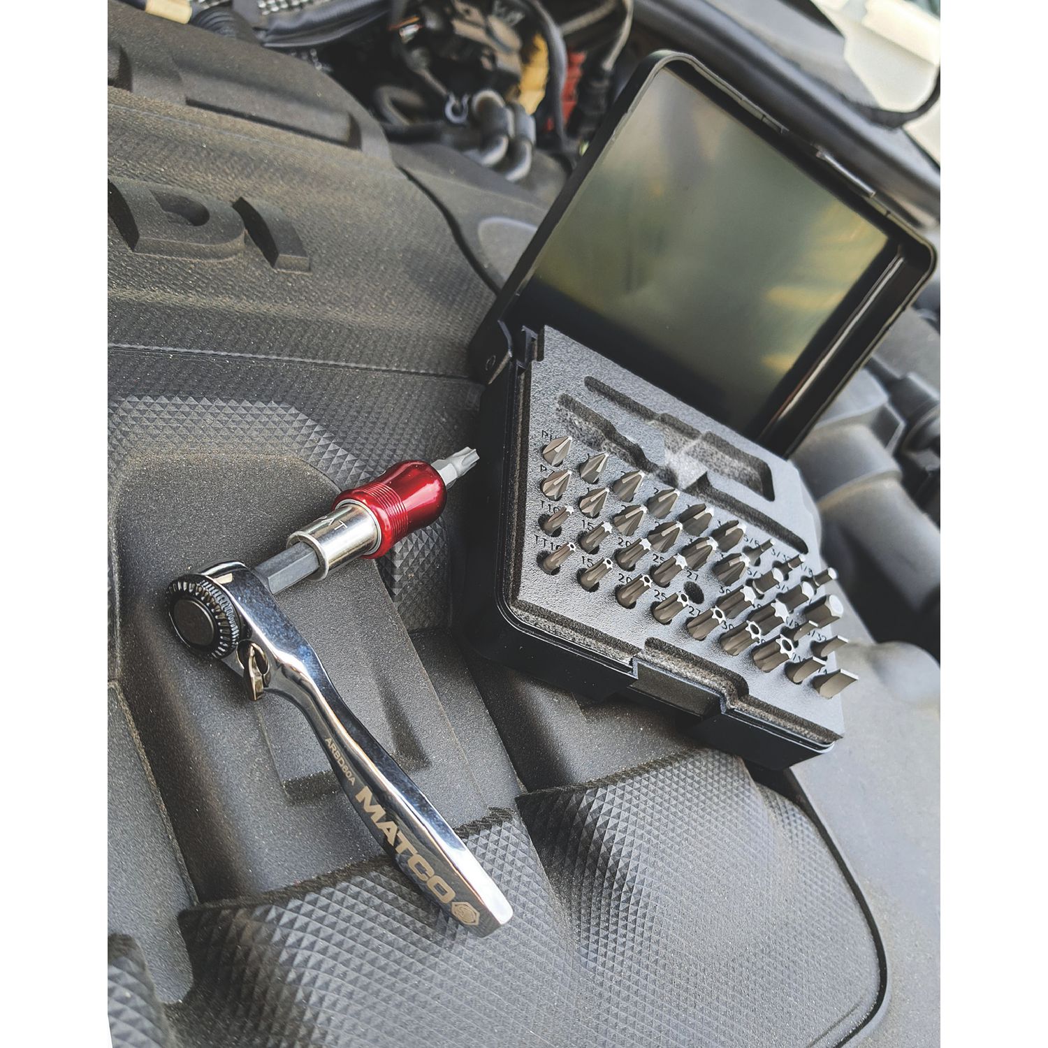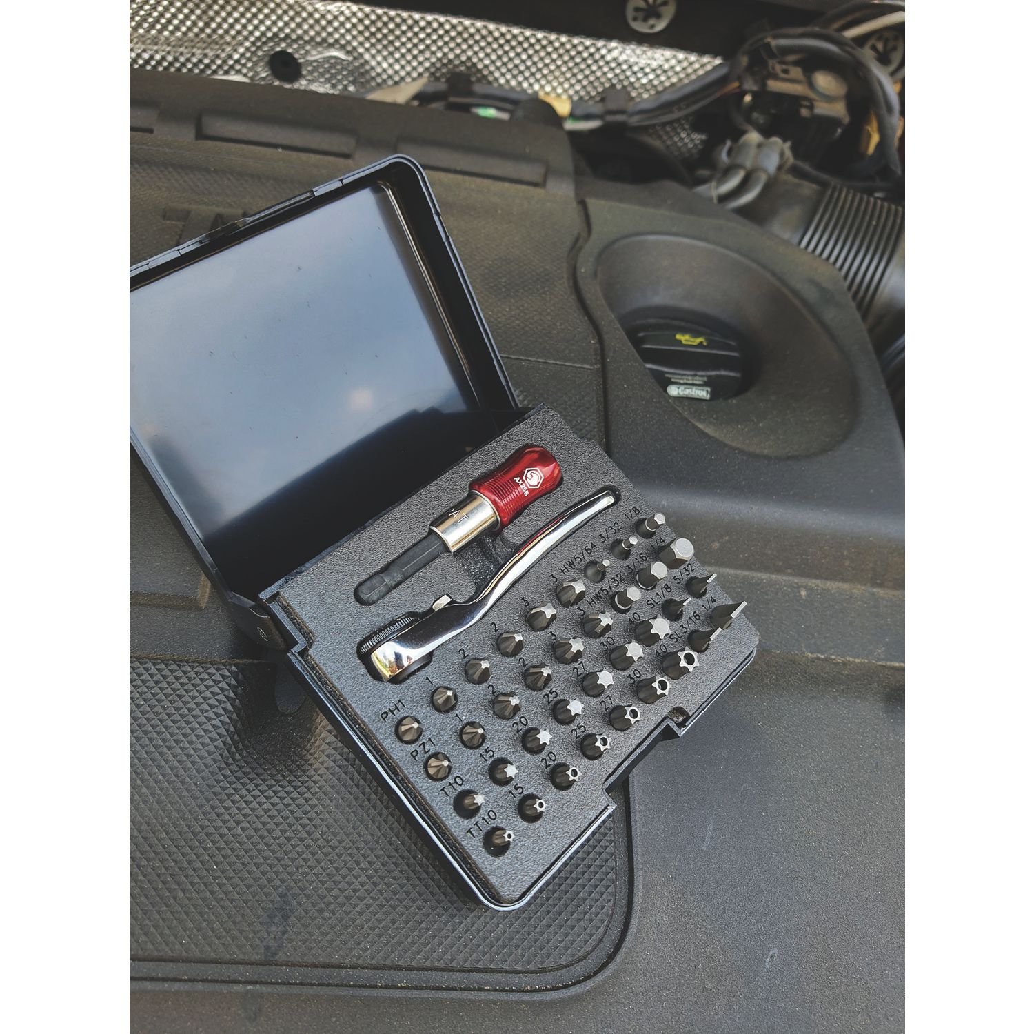 RATCHET AND BIT SET. Includes ratchet and 36 S2 bits to handle any application in a pocket-size case