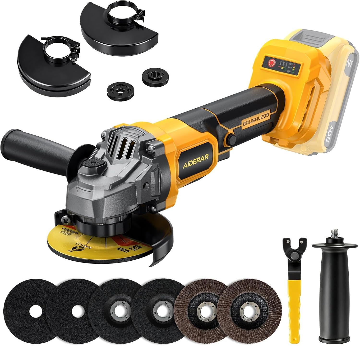 WHAT YOU GET: 1x Aiderar Grinder Power Tool (NO Battery/charger), 1x Standard Guard(Guard for Grinding), 1x Half Guard(Guard for Cutting), 1x Spare Flange Set, 1x Ergonomic Design Multi-Angle Leverage Wrench, 1x Side Handle, 2x Sanding Wheels, 2x Cutting Wheels, 2x Flap Discs, 1x User Manual—plus our responsive customer support.