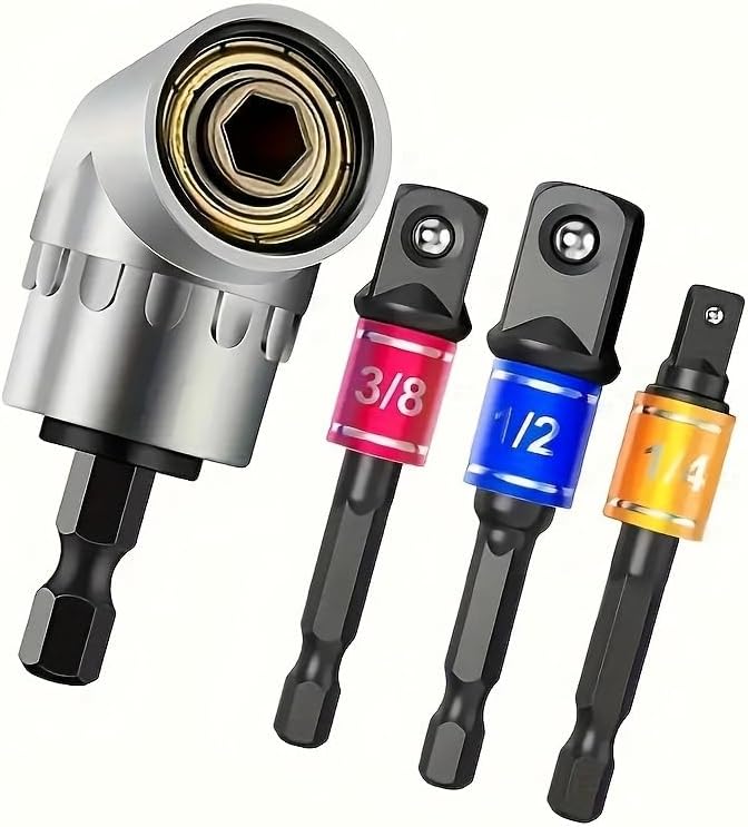 4pcs Impact Grade Power Tool Set with Socket Adapter & Extension – Durable Metal Construction, Includes 1/4″, 3/8″, 1/2″ Hex Shank Drill Bits, Nut Driver, and 105° Right Angle Attachment