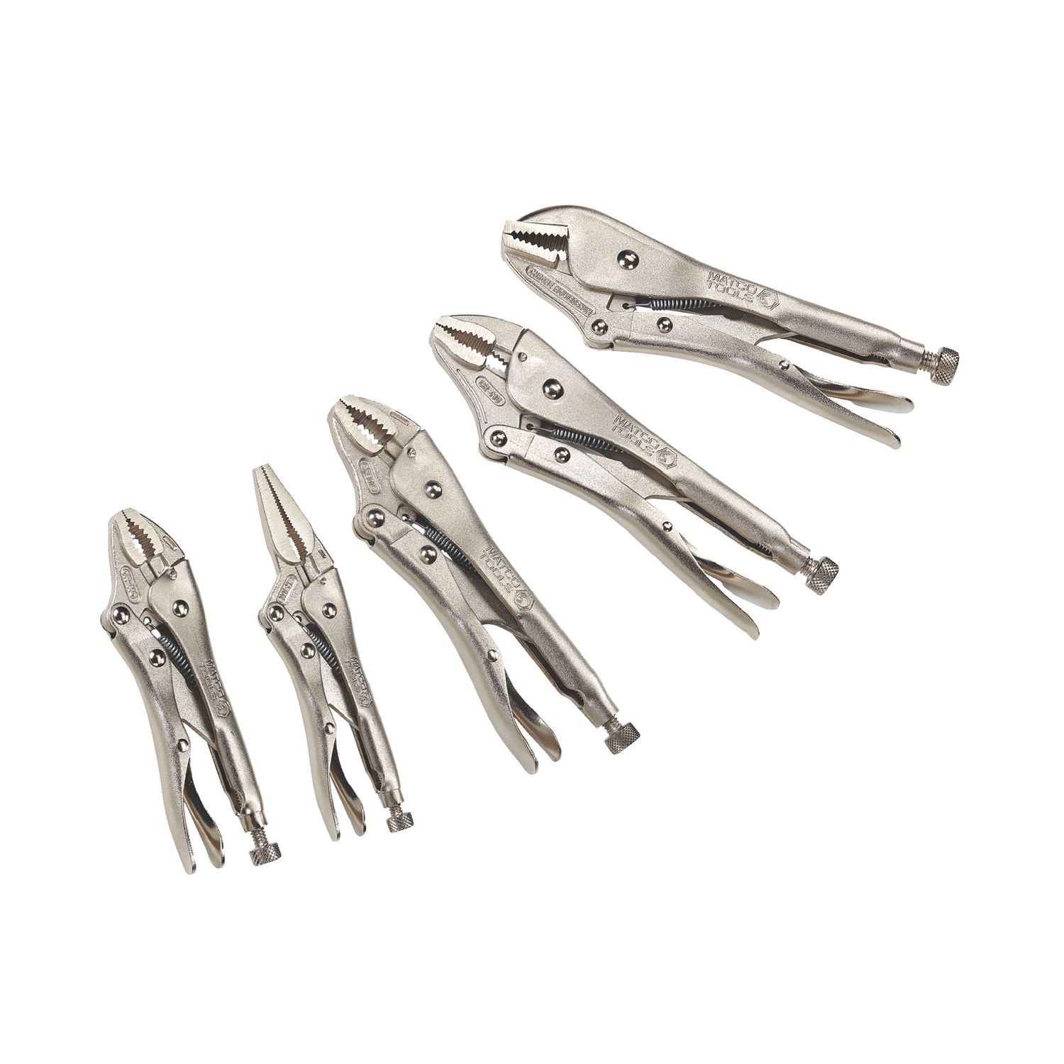 Set includes 5 of the most popular locking pliers: 5\” curved jaw locking pliers, 6\” needle nose locking pliers, 7\” curved jaw locking pliers, 10\” straight jaw locking pliers, and 10\” curved jaw locking pliers