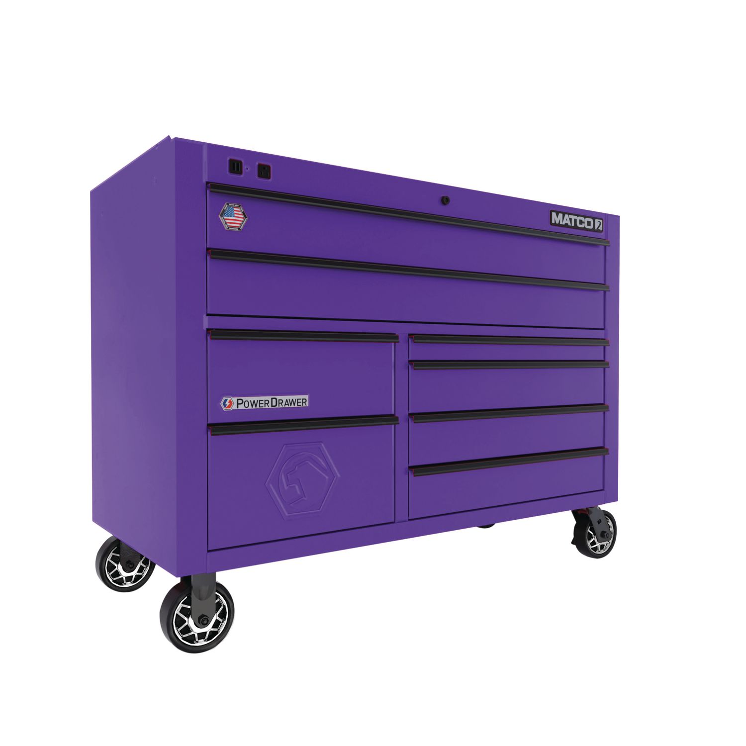 INTEGRATED POWER. Power drawer included for tool charging and front convenience power is standard on each toolbox (110V and USB)