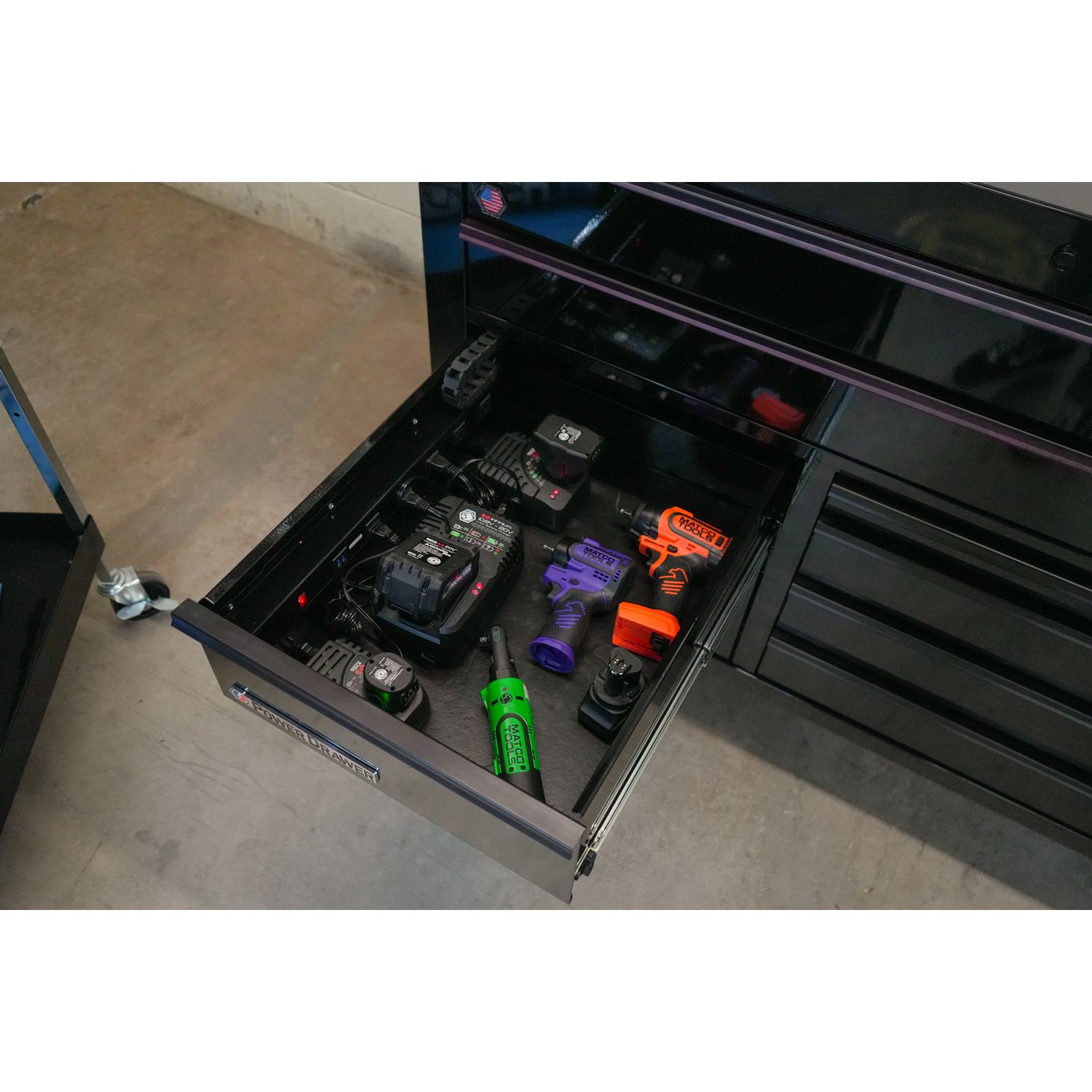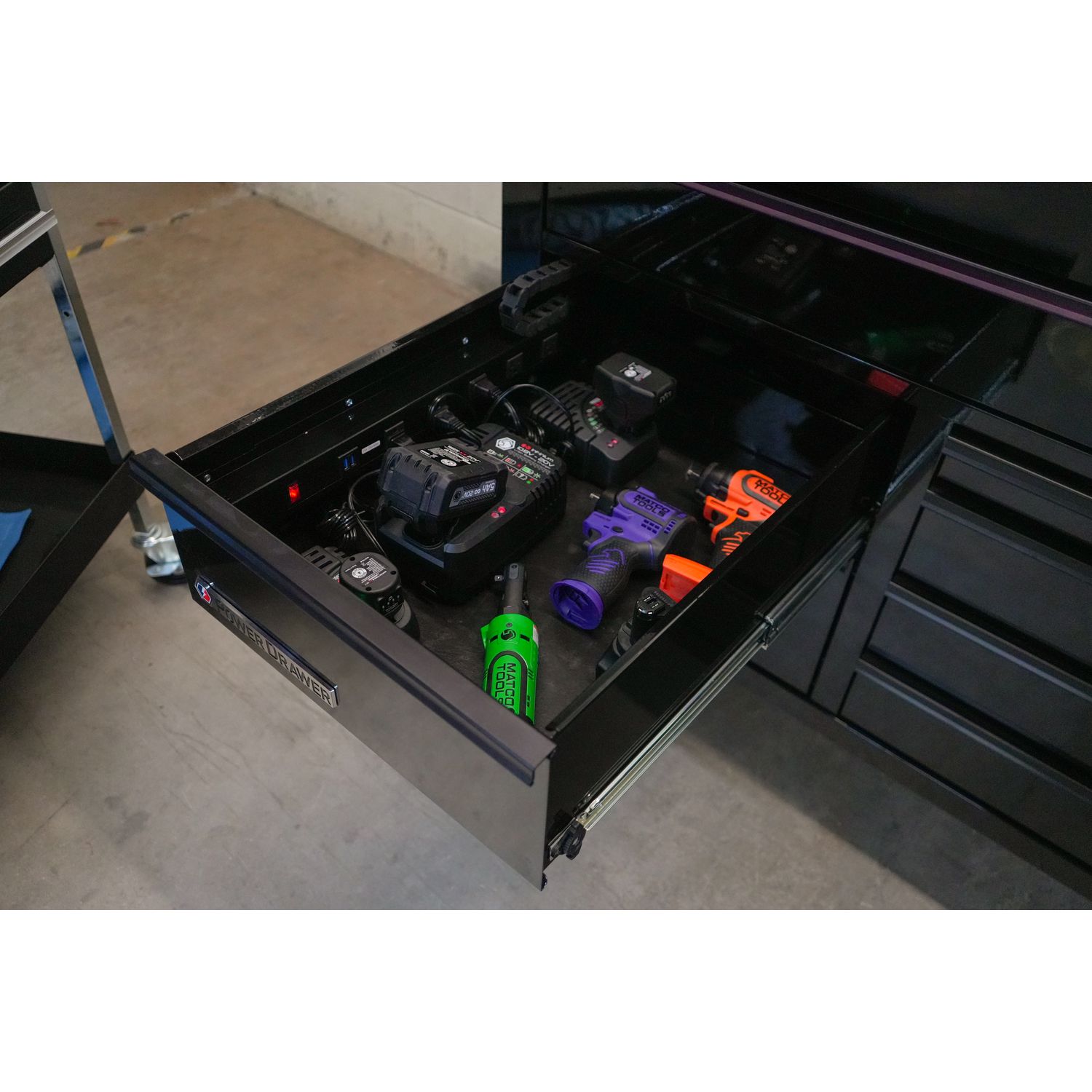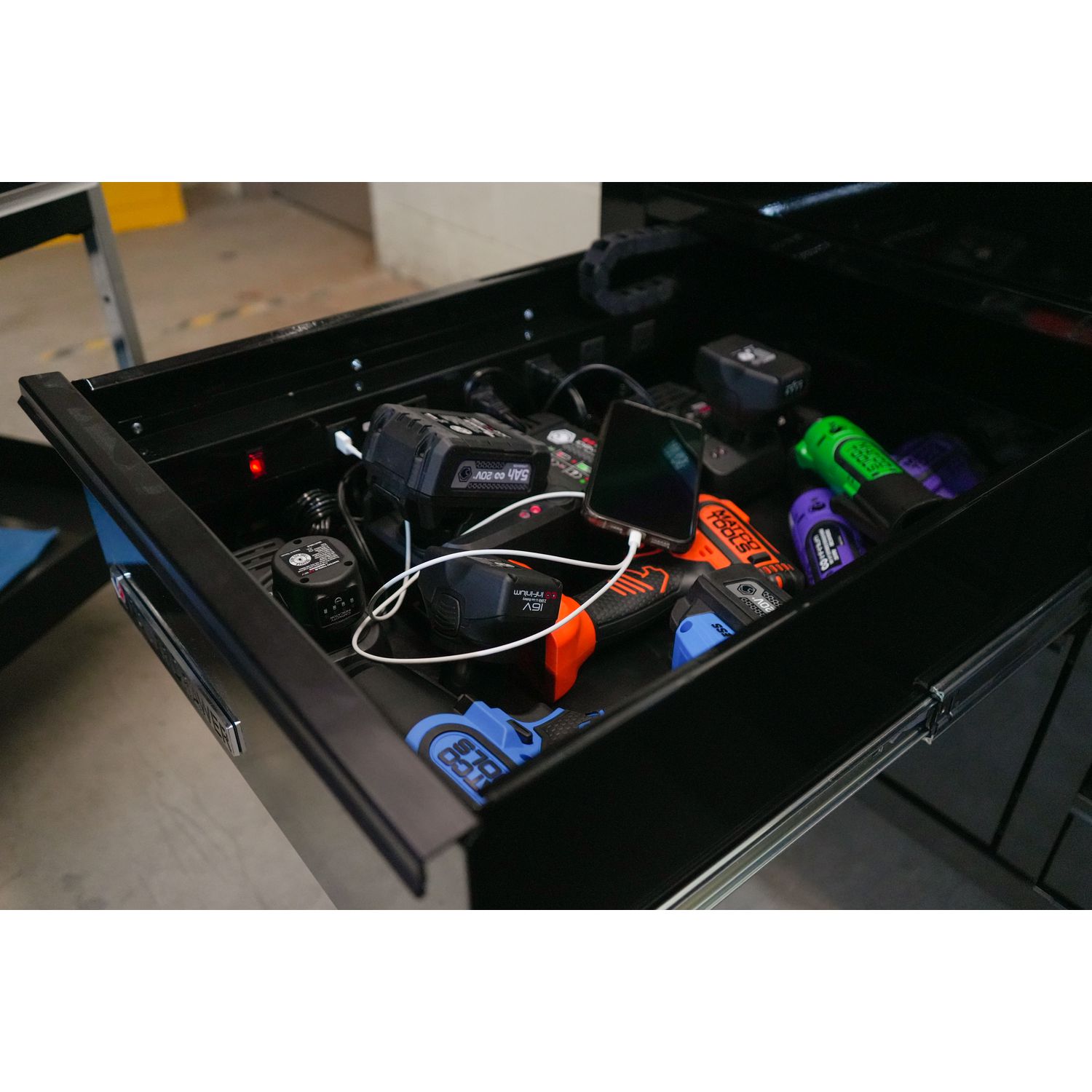 INTEGRATED POWER. Power drawer included for tool charging and front convenience power is standard on each toolbox (110V and USB)