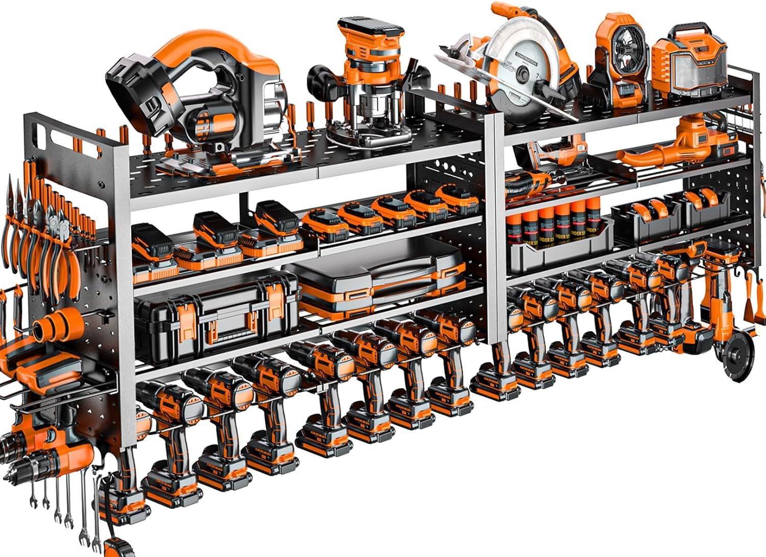 Maximize Garage Storage: Supercharge your garage organization with our industry-leading 66inch wide tool organizer,This drill holder wall mount holds up to 18 power tools, plus features for smaller items – offering maximum tool storage capacity for serious DIYers and pros.