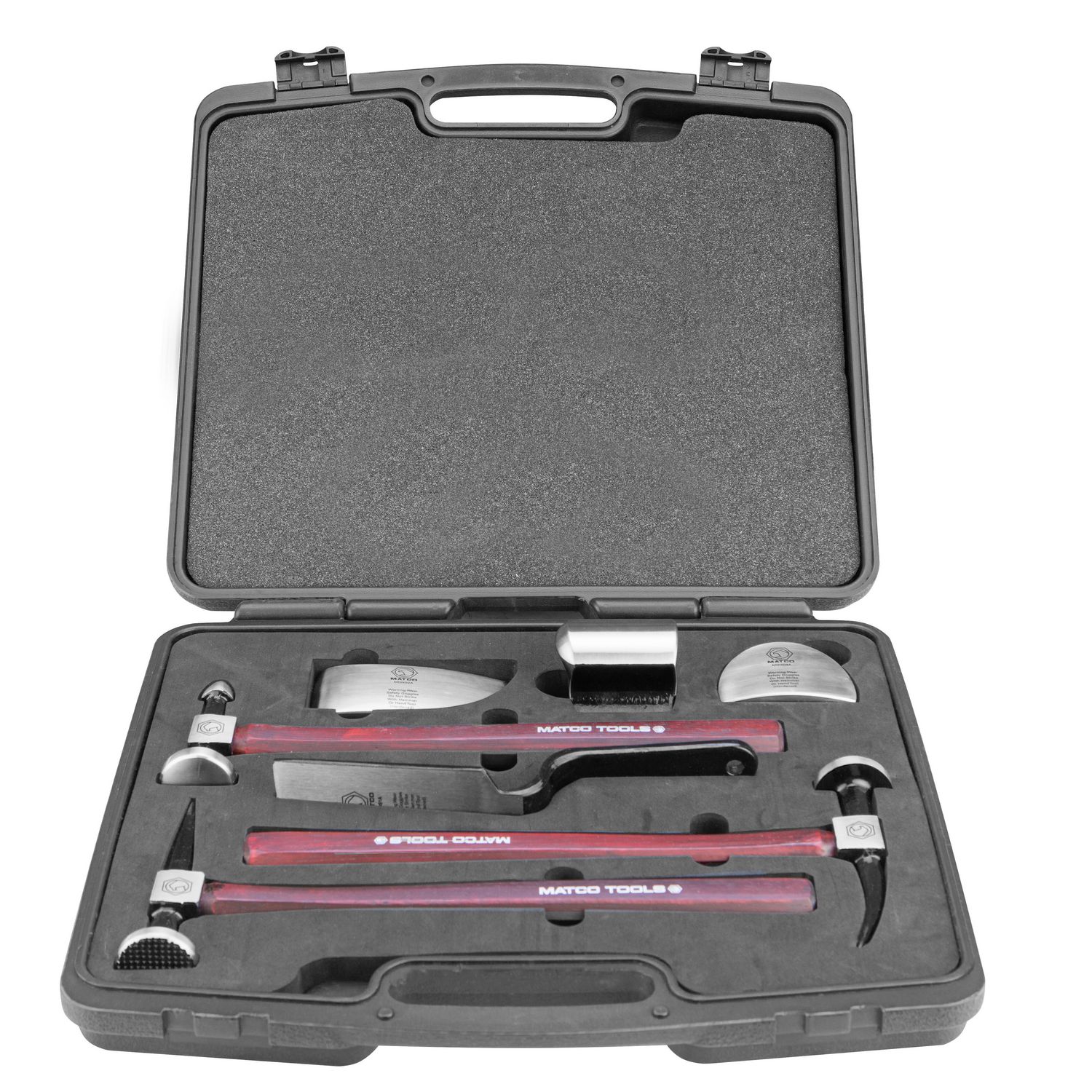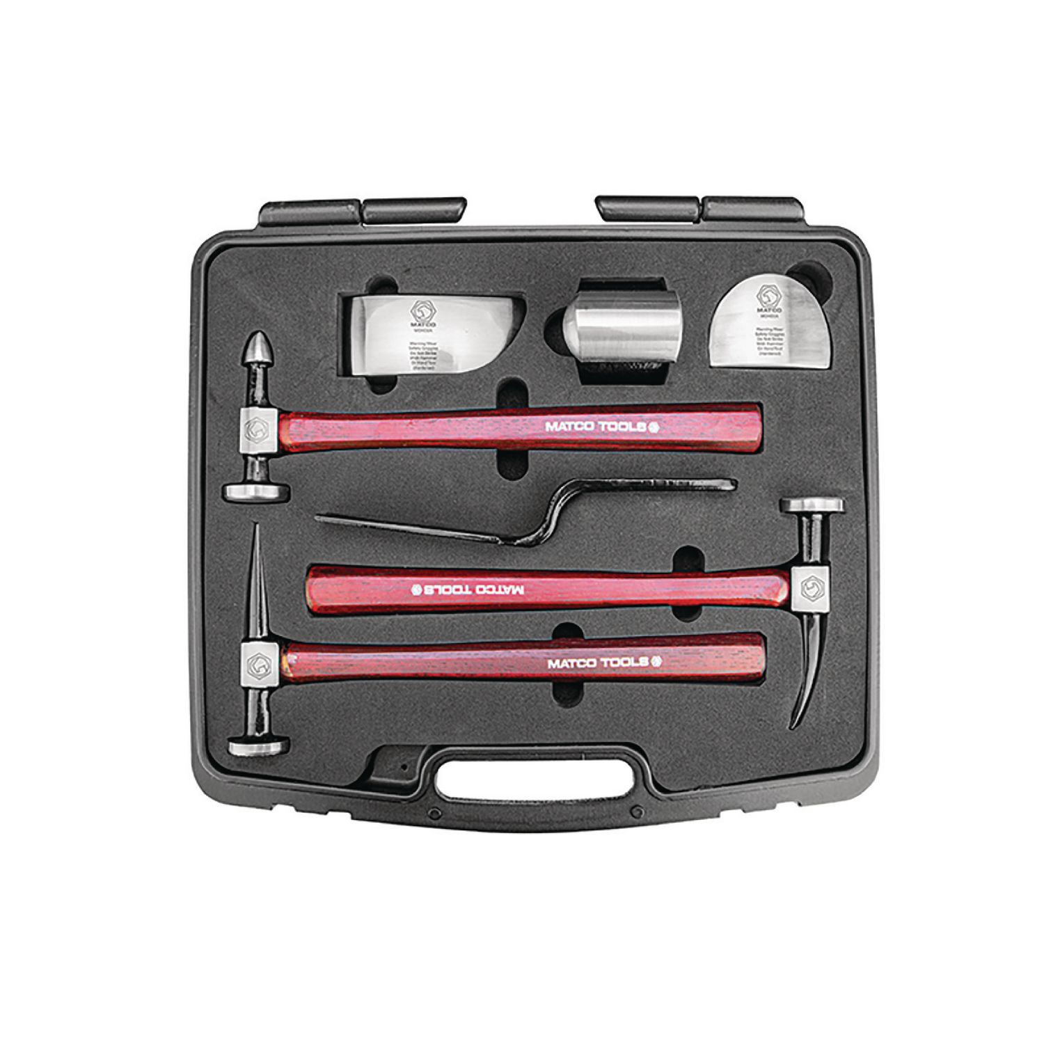 Comprehensive hammer and dolly repair set features all tools necessary for automobile fender, bumper and large or small body dent repairs