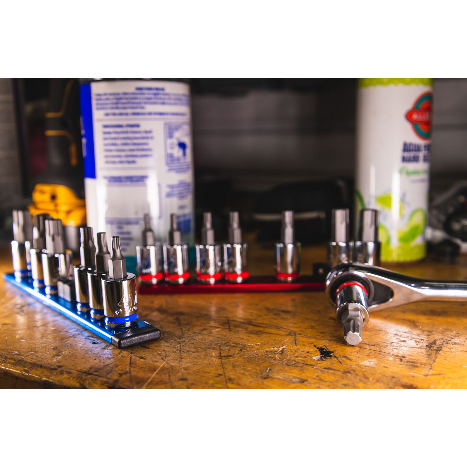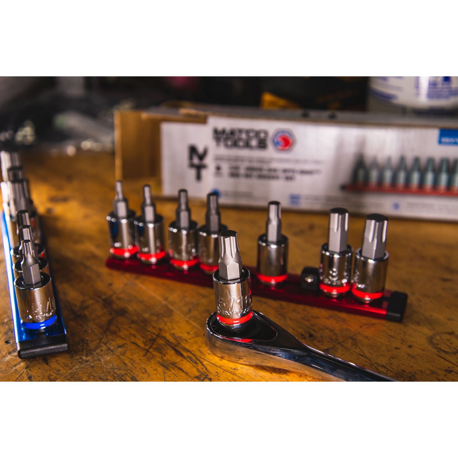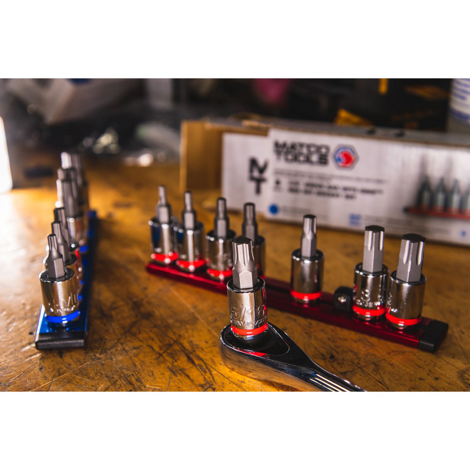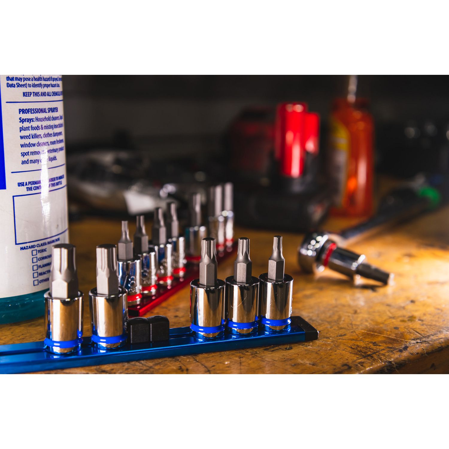 3/8\” DRIVE SAE BIT SOCKET SET. Includes sizes: 1/8\”, 5/32\”, 3/16\”, 7/32\” 1/4\” 5/16\” 3/8\”, and 7/16\” packaged on an aluminum socket rail