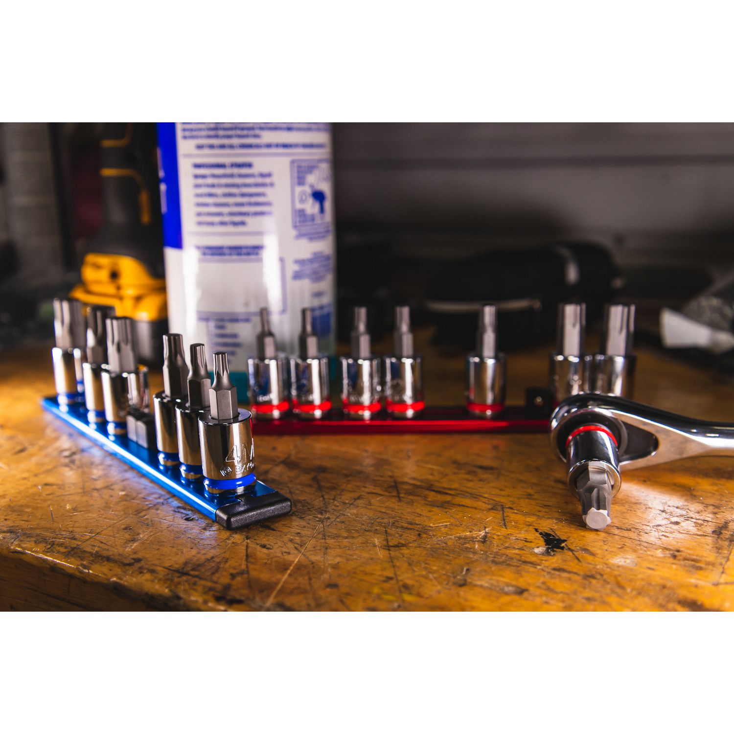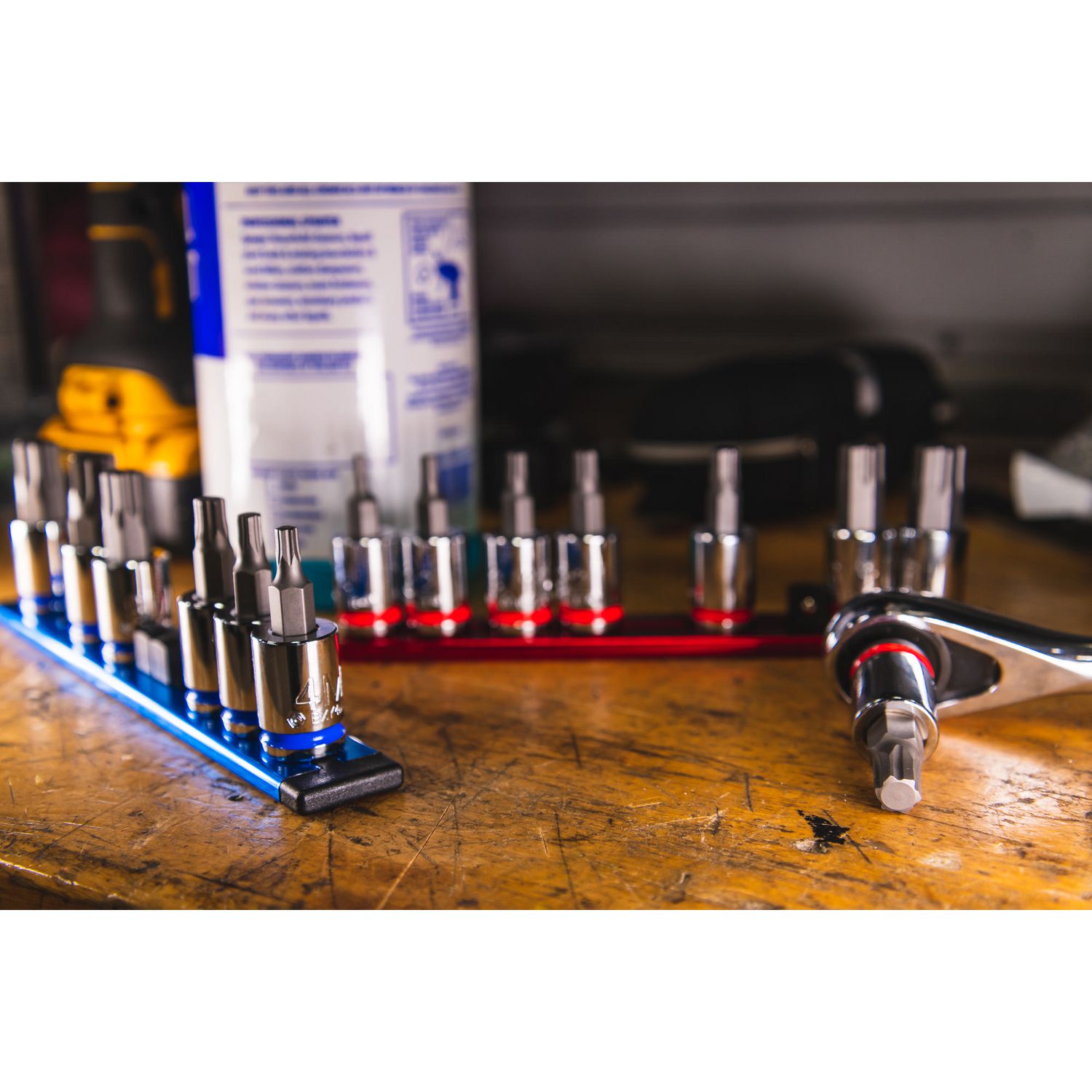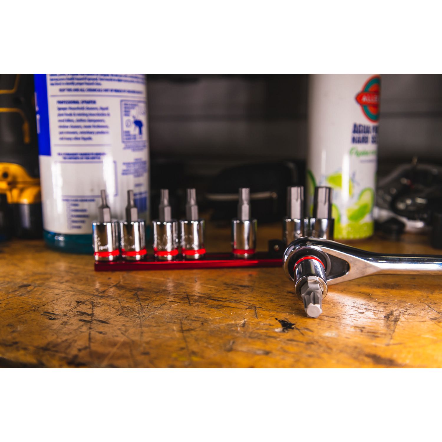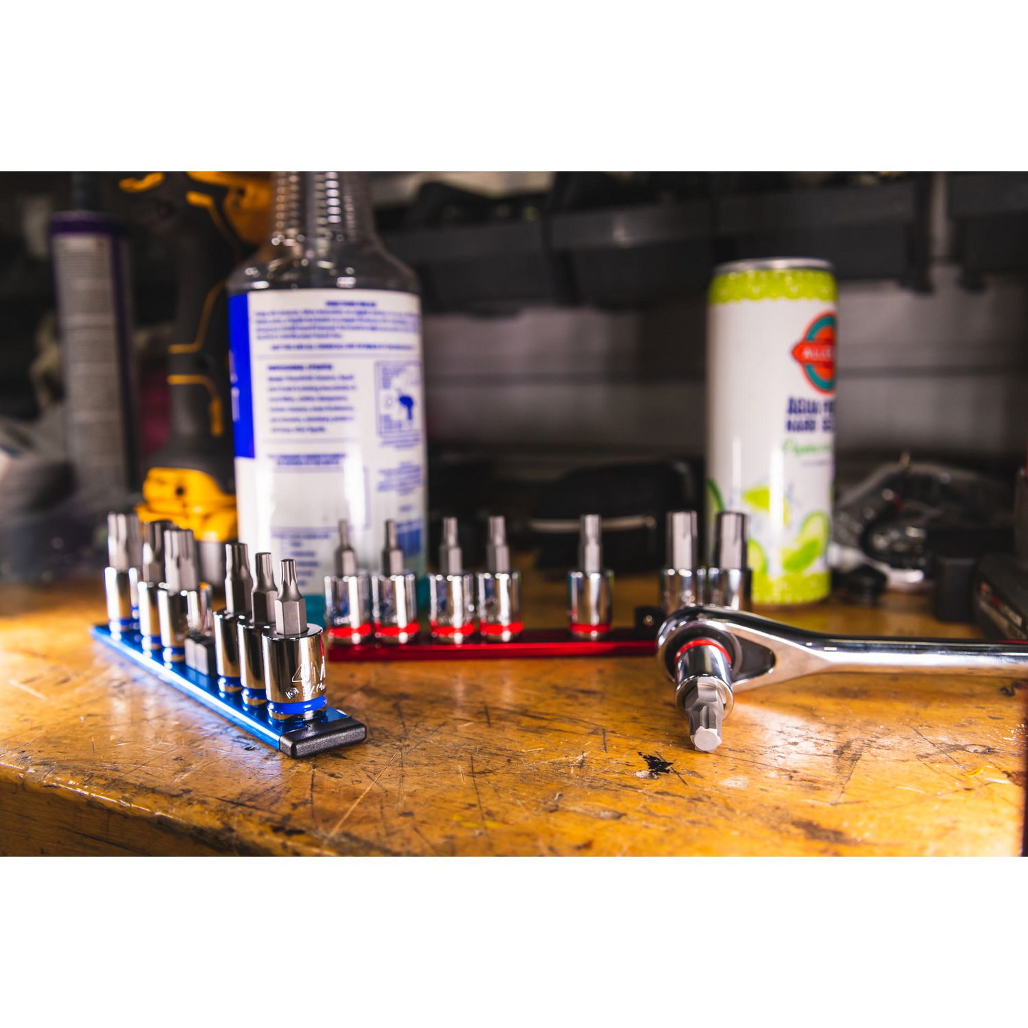 3/8\” DRIVE SAE BIT SOCKET SET. Includes sizes: 1/8\”, 5/32\”, 3/16\”, 7/32\” 1/4\” 5/16\” 3/8\”, and 7/16\” packaged on an aluminum socket rail