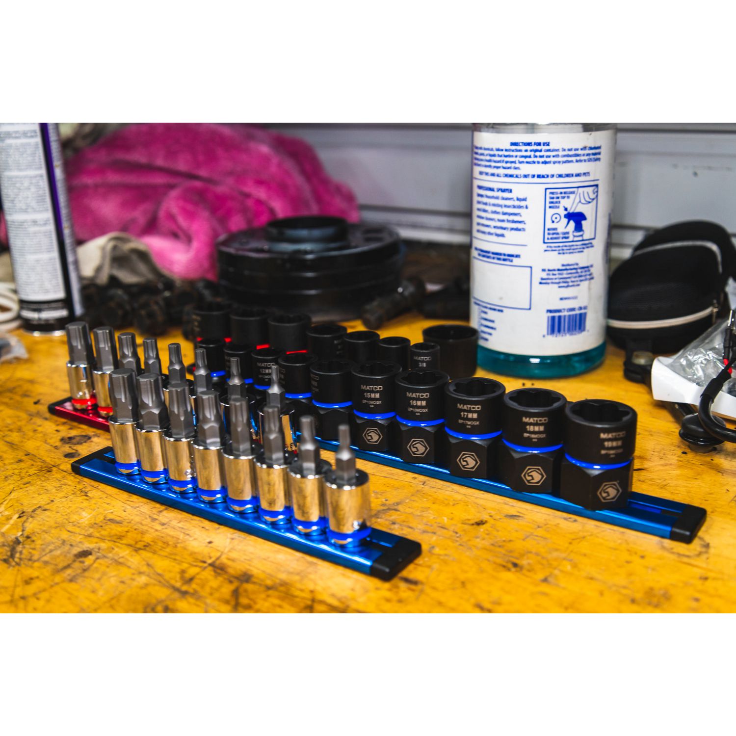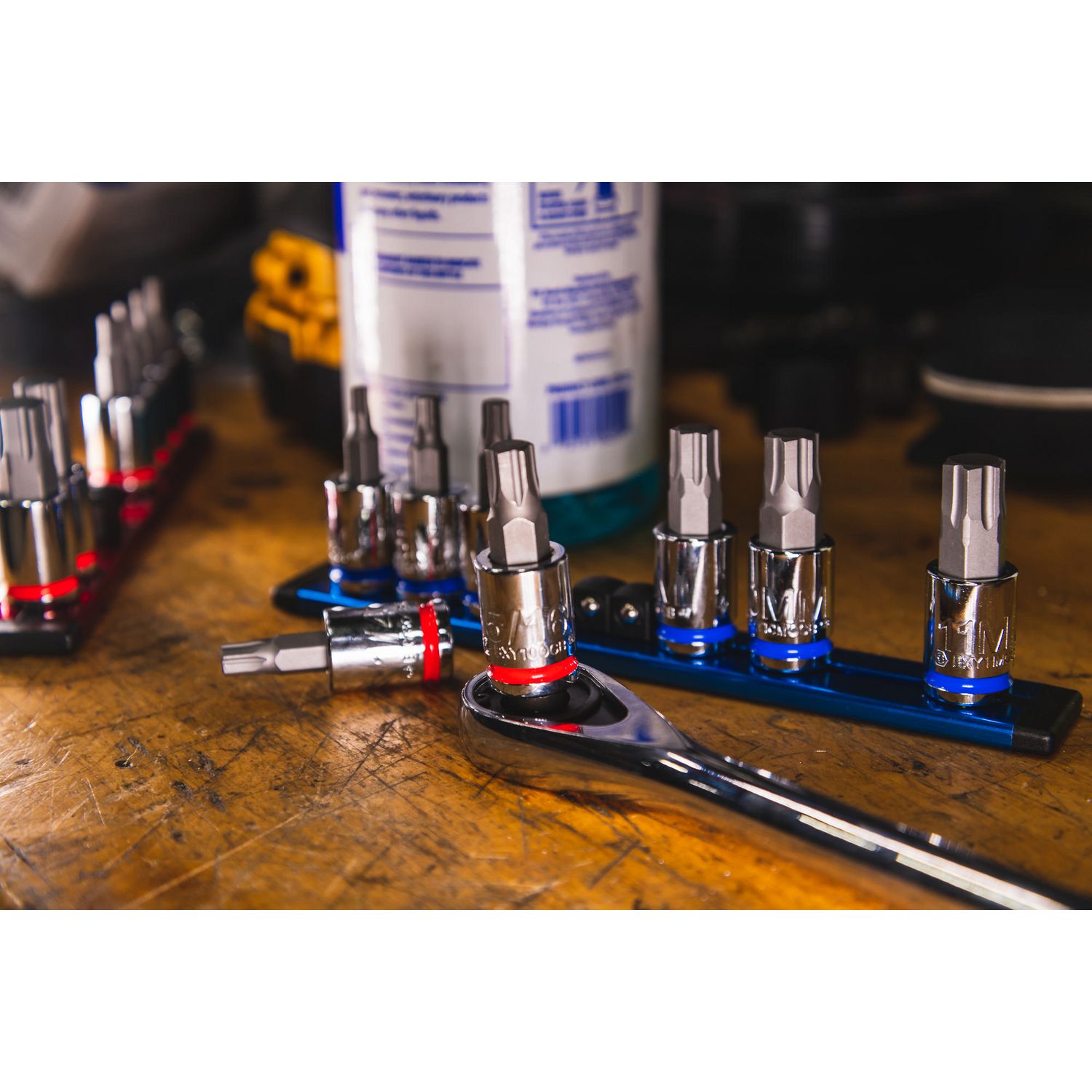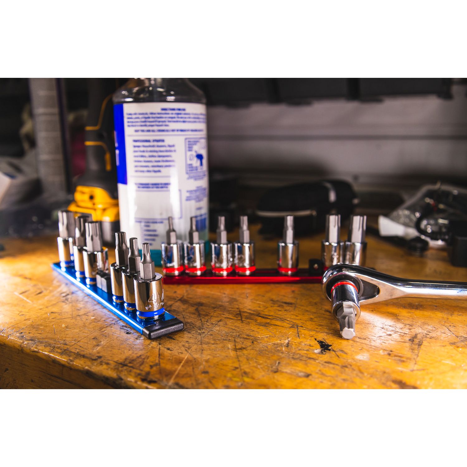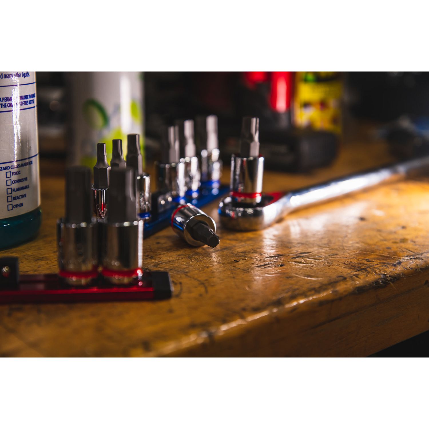 3/8\” DRIVE SAE BIT SOCKET SET. Includes sizes: 1/8\”, 5/32\”, 3/16\”, 7/32\” 1/4\” 5/16\” 3/8\”, and 7/16\” packaged on an aluminum socket rail