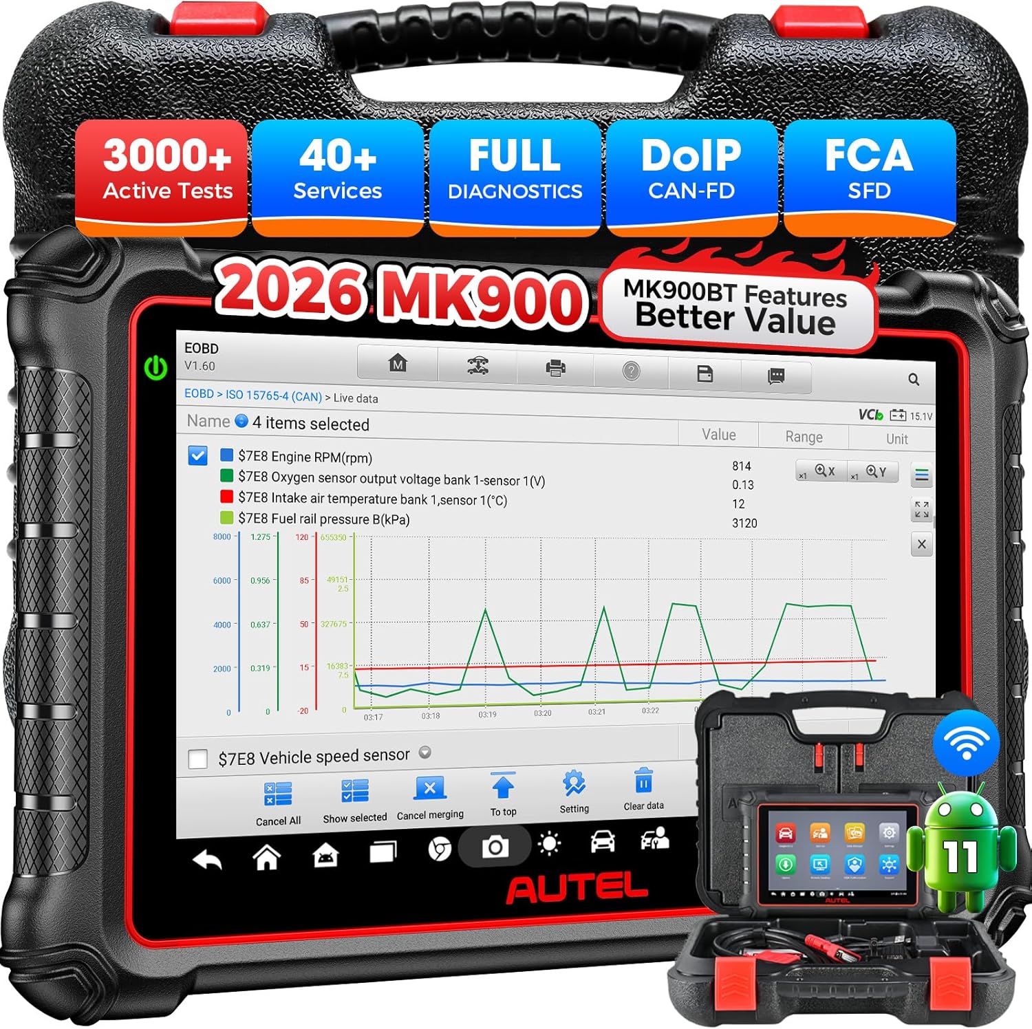 The Autel MaxiCOM MK900 is a high-performance 2026 diagnostic scanner that bridges the gap between advanced DIY tools and professional workshop equipment. It features easy to use OE-level all-system diagnostics and full bidirectional control, making it a significant upgrade over previous models like the MK808 series.Performance and Key Features* Bidirectional Control: The tool supports over 3,000 active tests, allowing users to send commands directly to ECUs to test components like fuel injectors, cooling fans, and window regulators.* Service Capabilities: It includes 40+ maintenance functions, such as ABS bleeding, injector coding, DPF regeneration, and battery registration.* Modern Protocols: Supports the latest vehicle communication standards, including DoIP and CAN FD, ensuring compatibility with newer vehicles without additional adapters.* Hardware Specifications:* Display: 8-inch LCD touchscreen with 1280×800 resolution.* OS/Processor: Runs on Android 11 with a Quad-core 1.8GHz processor.* Battery: 7700mAh capacity for extended diagnostic sessions.* Storage: 4GB RAM and 64GB ROM for fast application loading.Pros and Cons* Pros:* Wired Connection: The MK900 model uses for fast & stable wired connection.* Build Quality: Features a grease- and water-resistant casing with rubber bumpers for shop durability.* Comprehensive Coverage: Supports over 150 vehicle brands (1996–2026) and includes FCA AutoAuth for newer secured vehicles.* Cons:* TPMS Limitations: Unlike other MK900 variants, the standard MK900 only provides basic TPMS data reading and lacks sensor programming.* App Performance: Some users have reported occasional slow speeds or crashes during complex functions.Overall a great value for your money considering everything it can do saving you time & repair shop costs and allows you to more quickly evaluate used vehicle for better purchase decisions.