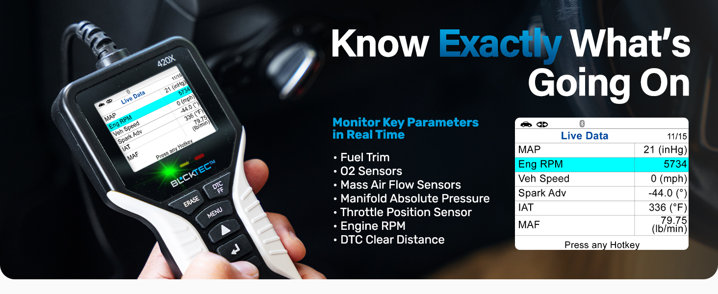 [2.4″ Big Screen, Enhanced Interface, Better Experience] – The BLCKTEC 420X is an upgraded version of our best-selling BLCKTEC 420. It features a 2.4″ screen—77% larger than the original—making diagnostic information easier to read. The redesigned buttons and improved user interface offer a smoother, more intuitive experience. With its sleek Killer Wheal design, the 420X stands out as both functional and stylish—something you’ll enjoy using while working on your car. The 420X OBD2 Scanner requires no battery or charger and is powered directly through your vehicle’s OBDII port.