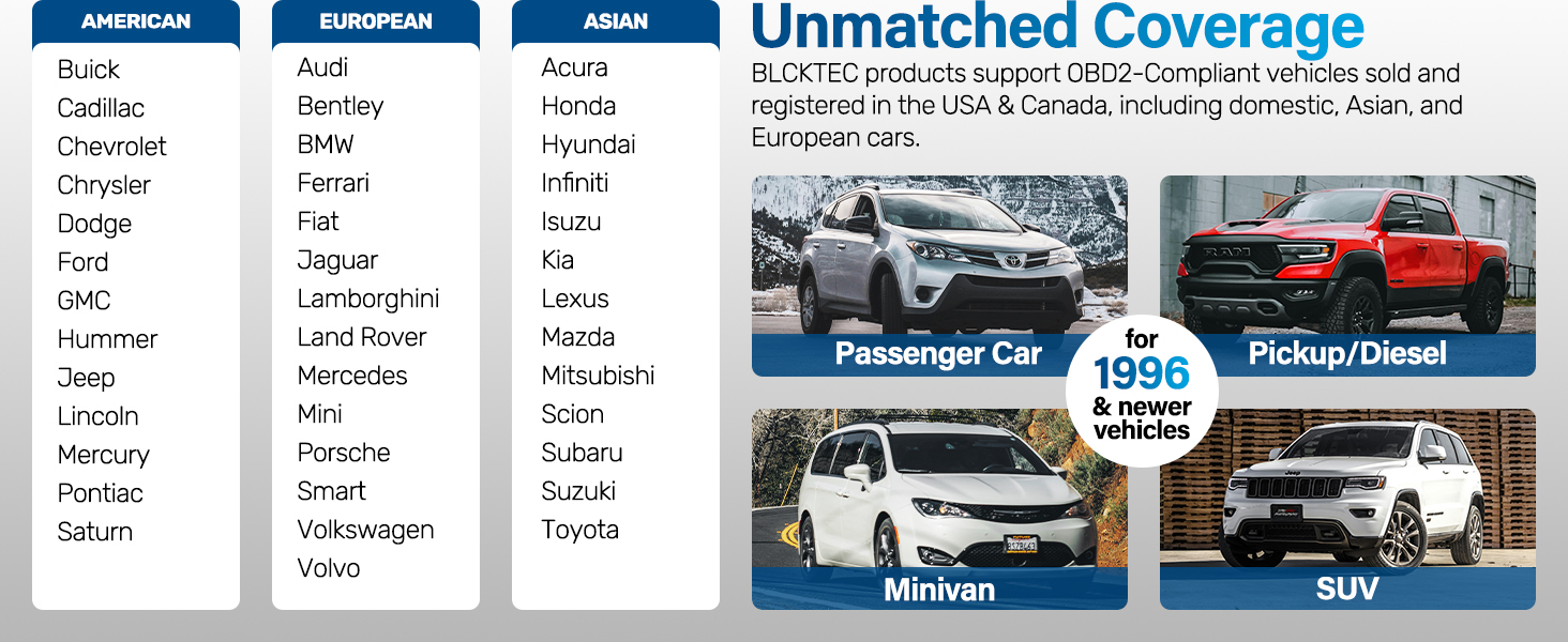 [Free Lifetime Update, Unmatched Vehicle Compatibility] – The BLCKTEC 420X comes with free lifetime updates, ensuring your scanner always has the latest diagnostic technology and supports new vehicle models. The 420X is compatible with all OBD2-compliant vehicles sold and registered in the USA and Canada from 1996 onward. This includes passenger cars, minivans, SUVs, pickups, light-duty trucks, and diesel vehicles manufactured by domestic, Asian, and European automakers.