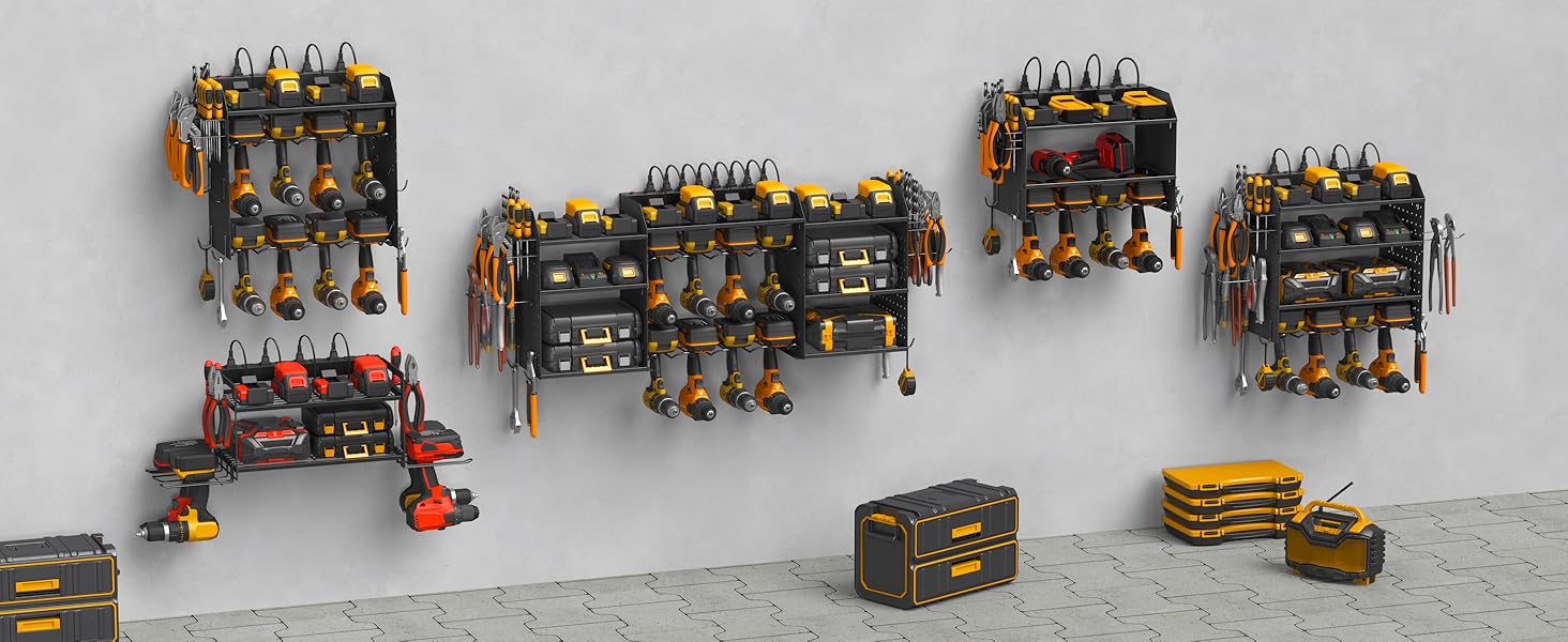 4 drills holder and tools organizer holes.Power tool organizer wall-mounted, double shelves.8 AC outlets charging station and surge protected.
