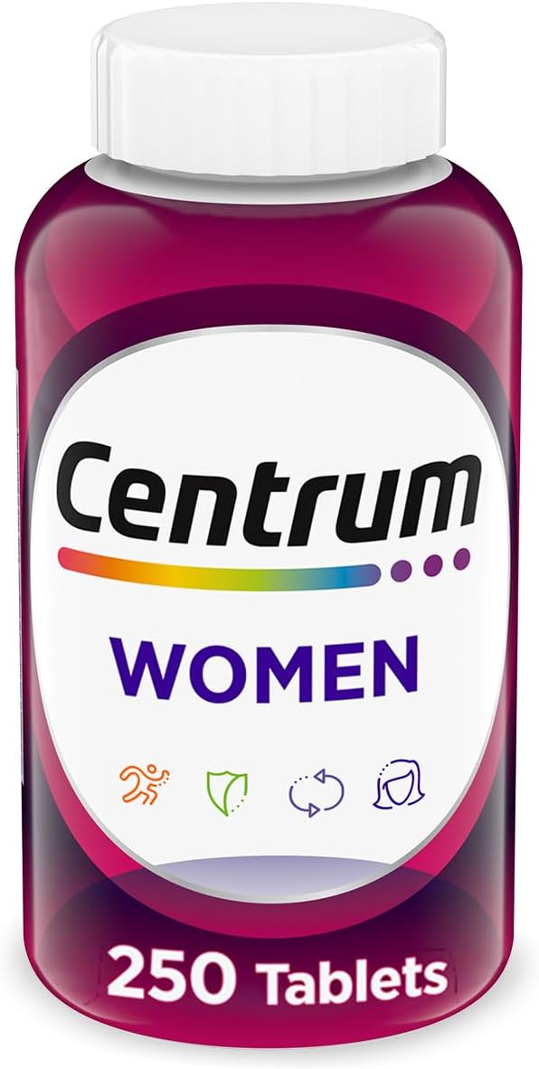 250 count bottle of Centrum Multivitamin for Women, Multivitamin/Multimineral Supplement with Iron, Vitamin D3, B Vitamins and Antioxidant Vitamins C and E