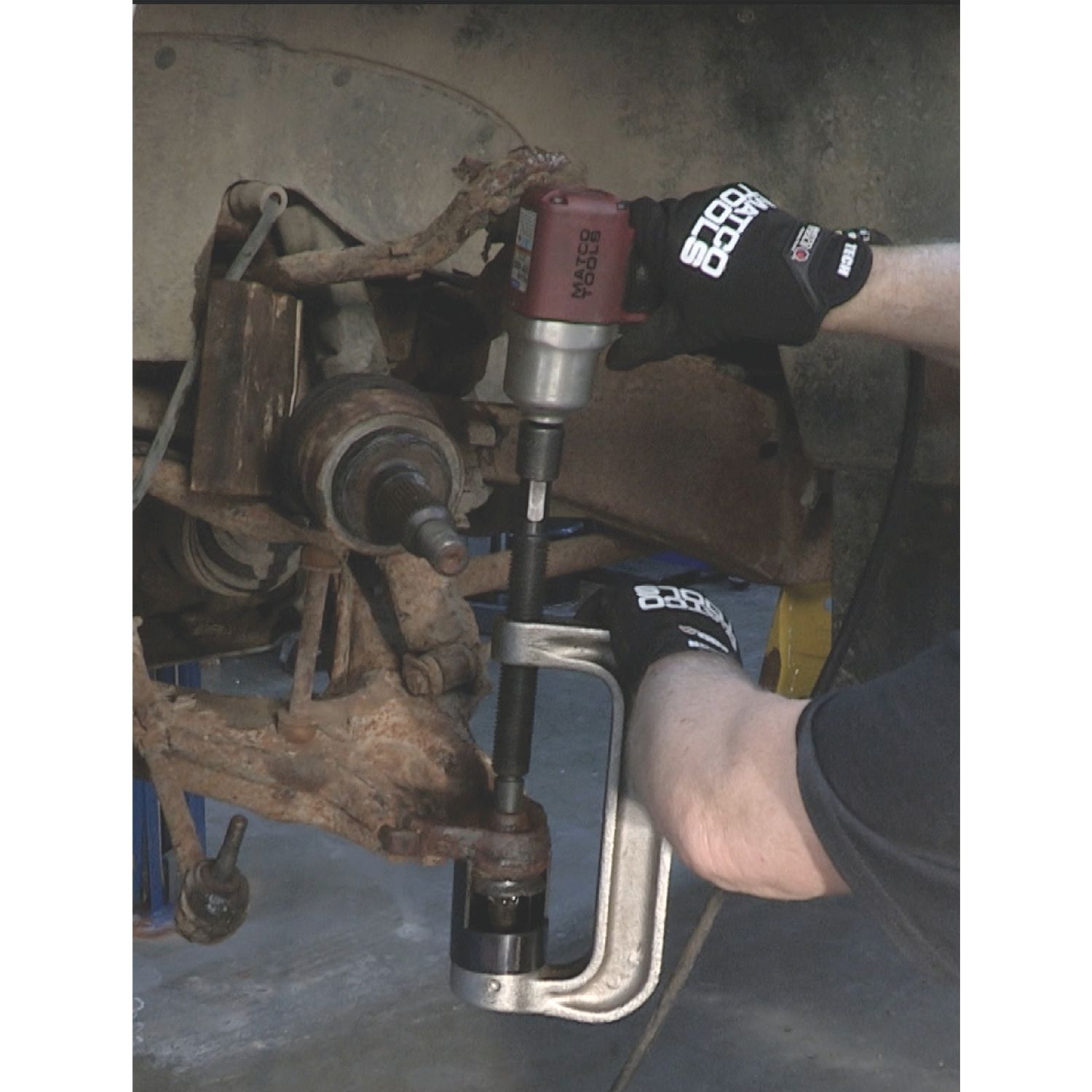 The connected adapter feature allows adapters to be captured on either end of the C-Frame, leaving the hands free to simply hold the assembly and operate an air impact