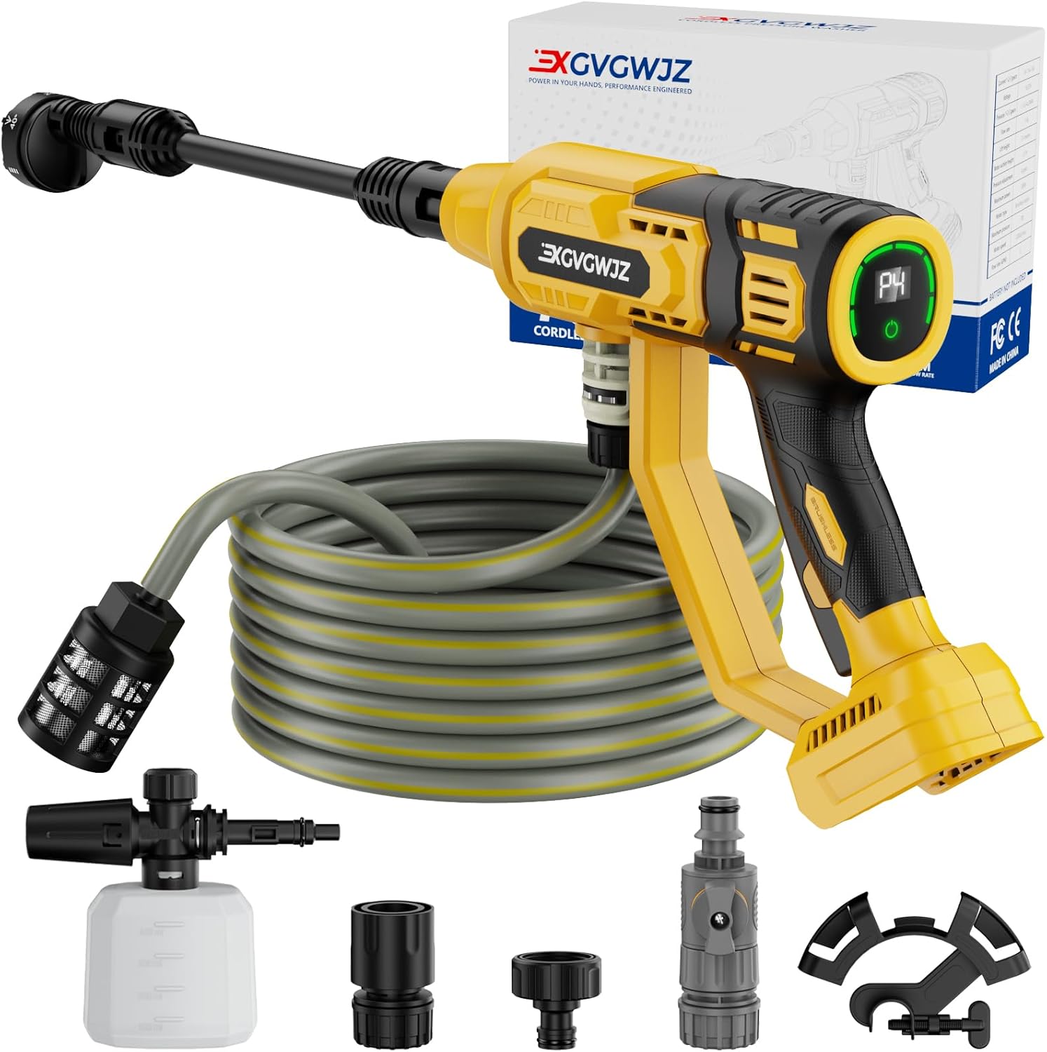 Cordless, Portable Handheld Power Washer/Pressure Washer 700PSI, 2GPM/GallonsPerMinute, 2.8 pounds, 16.4FT hose and dual filters4 pressure settings( gentle to strong)Compatible with Dewalt 20V Battery, FEATURES:Brushless Motor, 6-in-1 Nozzle, 4 Level Adjustable for Car/Floor/ Fence/Wall (Tool only/Battery and Battery Charger Not Included)Product kit includes: cordless pressure washer, 16.4FT hose, 6-in-1 nozzle, foam cannon, filter, stop valve, 3/4-inch threaded fittings, quick couplings, hose retainer, and instruction manual.USE CASE KEY INFORMATION:>Typical PSI Ranges & Uses:1000 – 1500 PSI: Ideal for gentle cleaning of vehicles, outdoor furniture, and delicate surfaces where high pressure could cause damage.1900 – 2800 PSI: medium-duty cleaning tasks – decks, siding, and patios, balance power + control.3000+ PSI: heavy-duty cleaning – driveways, heavily stained concrete, or preparing surfaces for painting>PSI + GPM:* GPM (Gallons Per Minute): water intake speed helps determine actual cleaning force; higher GPM means > water volume for faster cleaning. Nozzles & Modes: Different nozzles and settings (like ECO, High, Turbo) adjust spray for various tasksRATING: ⭐️⭐️⭐️⭐️⭐️RATING LEGEND:⭐️⭐️⭐️⭐️⭐️ Let’sGo!!⭐️⭐️⭐️⭐️ Very good, I like it⭐️⭐️⭐️ Good, functions as advertised.⭐️⭐️ OK’ish, Uncertainty lingers⭐️ Definite No 4 MeFIT: I was seeking a low end PSI unit for cleaning areas around my above ground pool(the less water penetration into the surrounding wood surfaces, the better).FUNCTIONALITY: it’s winter here and I haven’t yet tried it in earnestPRICE:  reasonable for its PSI/GPM tier, comparative to the marketplaceQUALITY: I expect the quality to be solid and without a full season of use I won’t yet know the durability.VALUE: low end PSI unit for cleaning areas around my above ground pool(the less water penetration into the surrounding wood surfaces, the better).- PRODUCT LISTING OVERVIEW – -Equipped with a high-efficiency 380W brushless motor, water pressure of up to 700 PSI, stable flow rate of 2 gallons per minute, easily removing stains without damaging surfaces.-The brushless motor technology not only ensures stable operation, reduces operating noise and energy consumption, but also extends service life and lowers maintenance costs, bringing you a long-lasting, worry-free professional-grade cleaning experience.-Fully compatible with DeWALT 20V MAX batteries, including models DCB200, DCB201, DCB203, DCB204, DCB206, DCB230, DCB240, DCB246, DCB248, DCBP520, and more.-The included 16.4FT hose and dual filters allow direct access to water sources such as buckets, pools, or lakes, effectively blocking sand and debris to prevent clogging and pump damage. Standard connection fittings are also included for easy connection to 3/4-inch universal faucets or garden hoses, freeing you from water source limitations and enabling you to start cleaning anytime, anywhere.- 6-in-1 nozzle that easily switches between 0°, 15°, 25°, and 40° spray and shower modes with a simple twist. Foam Cannon produces rich, fine cleaning foam for deep cleaning.- 2.8 pounds, the device is lightweight and easy to hold, making extended use effortless.- Light to moderate cleaning tasks such as washing vehicles, patio floors, windows, outdoor furniture, bicycles, and barbecue grills- We are committed to providing an excellent shopping experience. If you have any questions about the product or need support, please feel free to contact us. We offer 24/7 online after-sales service to ensure your peace of mind