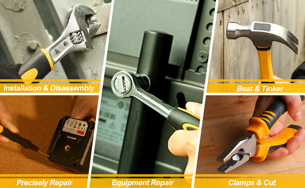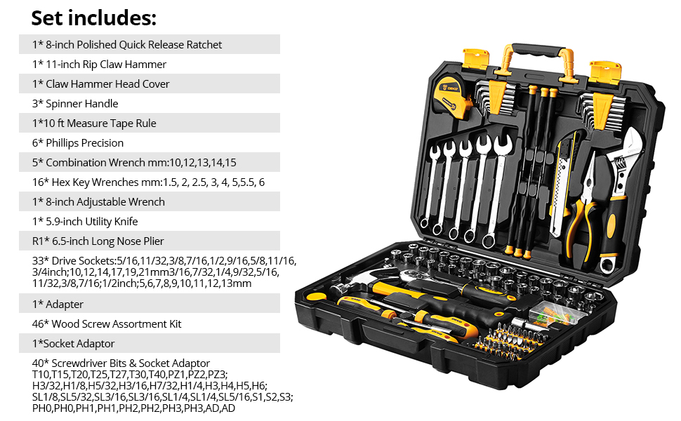 WIDE RANGE OF TOOLS — Our home tool set comes with a rich collection of tools to suit any job. You will receive combination wrenches, long nose pliers, polished quick release ratchet, adjustable wrench, rip claw hammer, measure tape rule, drive sockets and more.
