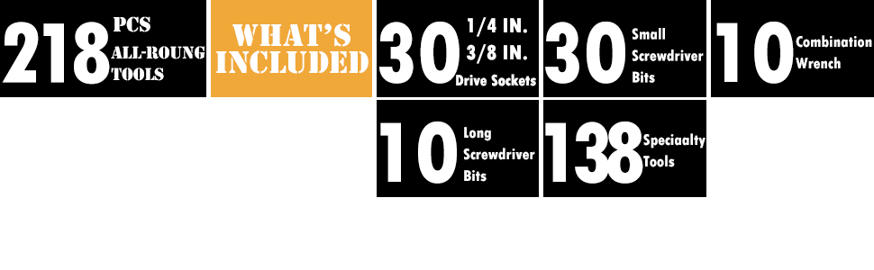 MULTI-APPLICATION: 218 pcs tool kit is perfect for home DIY projects and most small repairs, such as furniture assembling, garage constuction, woodwork, plumbing repair, car repairs, outdoor fittings, garden decoration,etc.