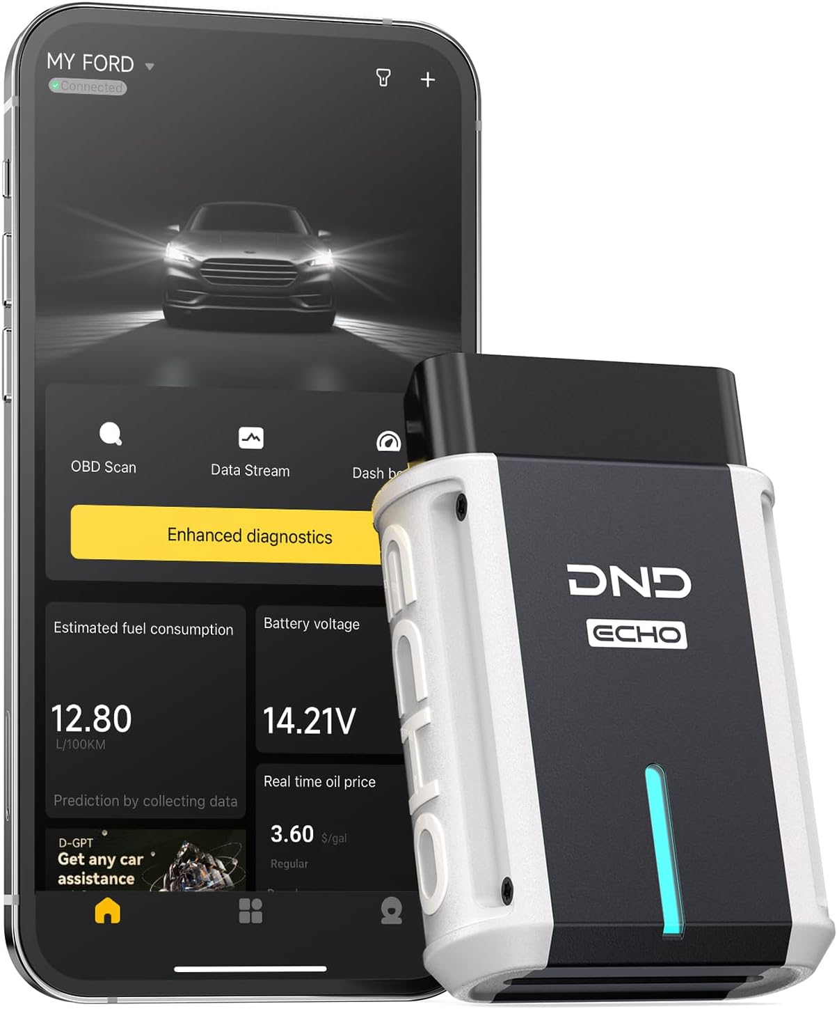 Experience Personalized Services Beyond Traditional Diagnostics: DND Echo compatible with many third-party apps like OBDFUSION, Car Scanner ELM OBD2, and more. Auto search the cheapest nearby gas stations for you and save on expenses. Customize dashboard offering insights beyond your car’s native display.