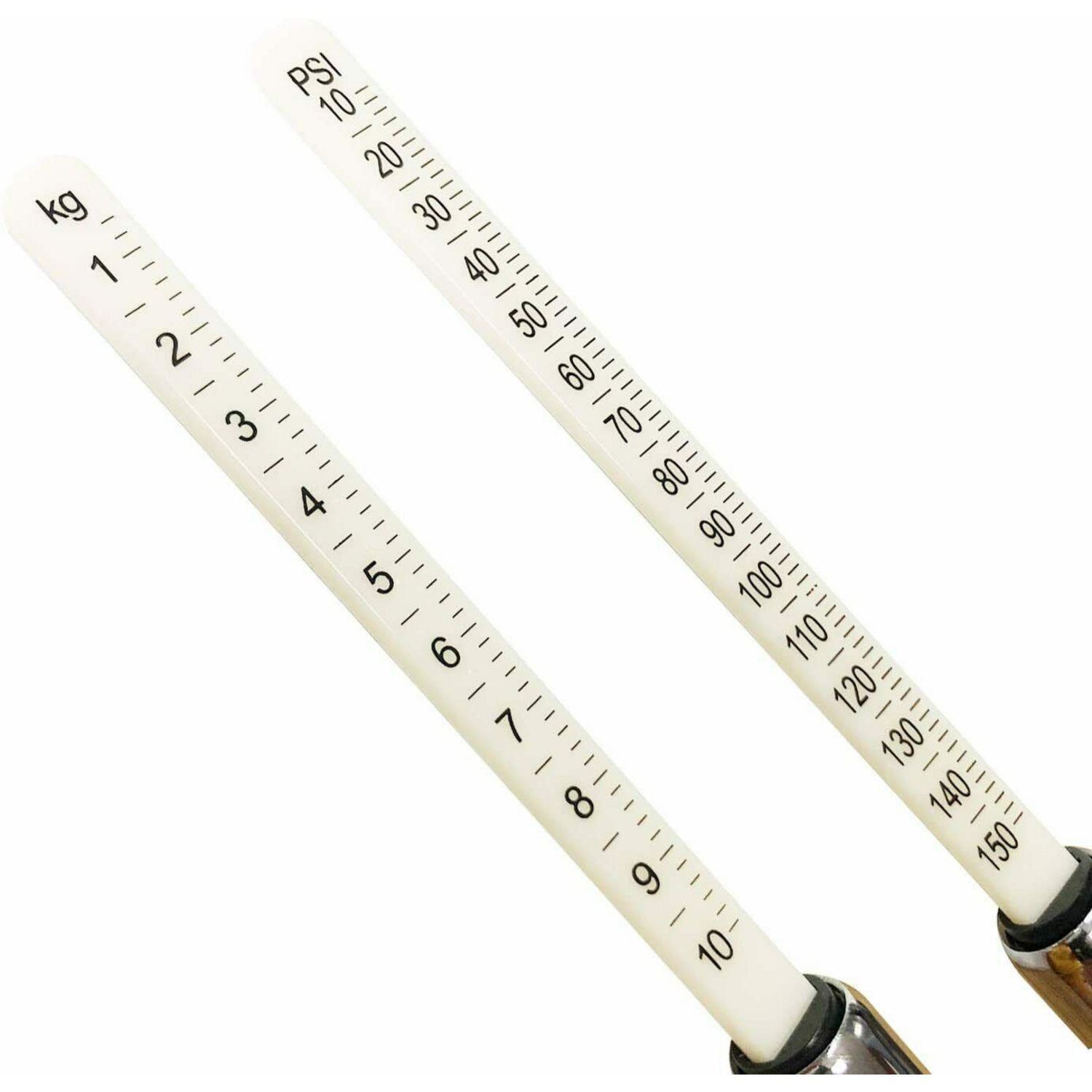 ACCURATE TIRE PRESSURE GAUGE. 2 sided white ABS scale plate with clear marks, one side with black scale 10-150PSI, and the other side with red scale 1-10kg, accurate and reliable, perfect for truck, car, SUV, RV, ATV, bike or motorcycle