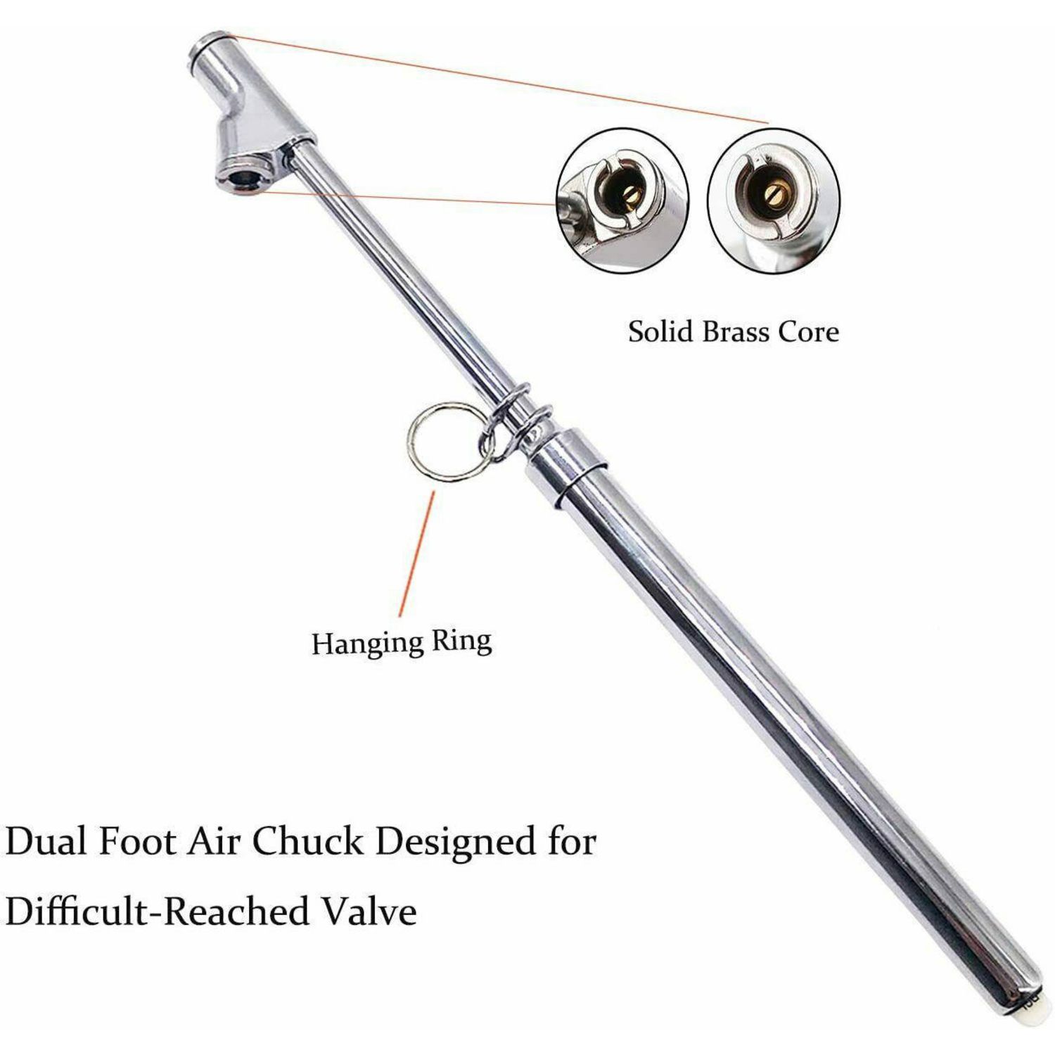 STRAIGHT FOOT DUAL HEAD CHUCK DESIGN. Air gauge is equipped with two zinc alloy head push-pull chucks, straight head is specially designed for inner/single wheels or hard-to-touch valves, and 30° reverse chuck for outer wheels.