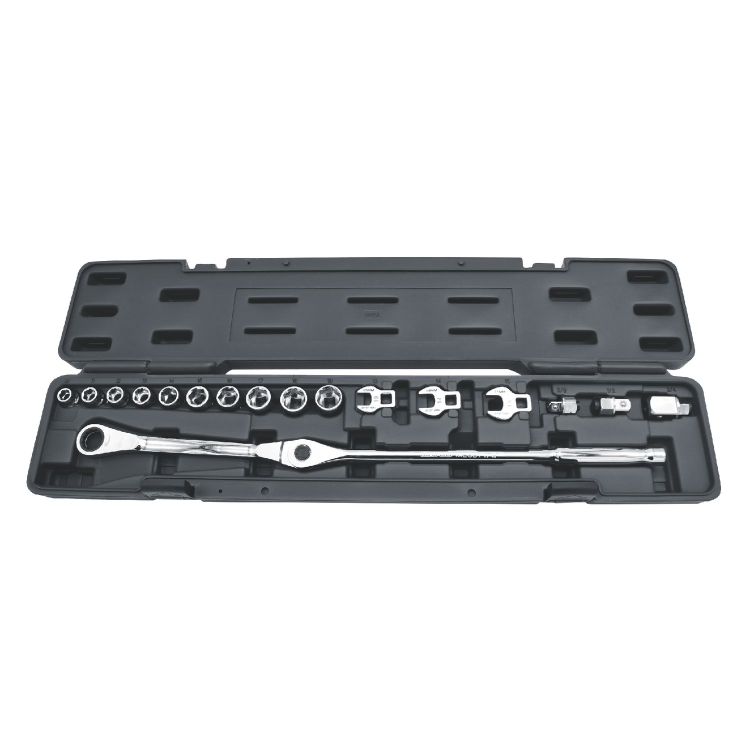 Includes locking quick adjust ratchet and 16 attachments: 10mm -19mm low profile sockets, push-release 3/8\”, 1/2\” and 3/4\” square drive adapters \u0026 13mm, 14mm and 15mm crowfoot wrenches