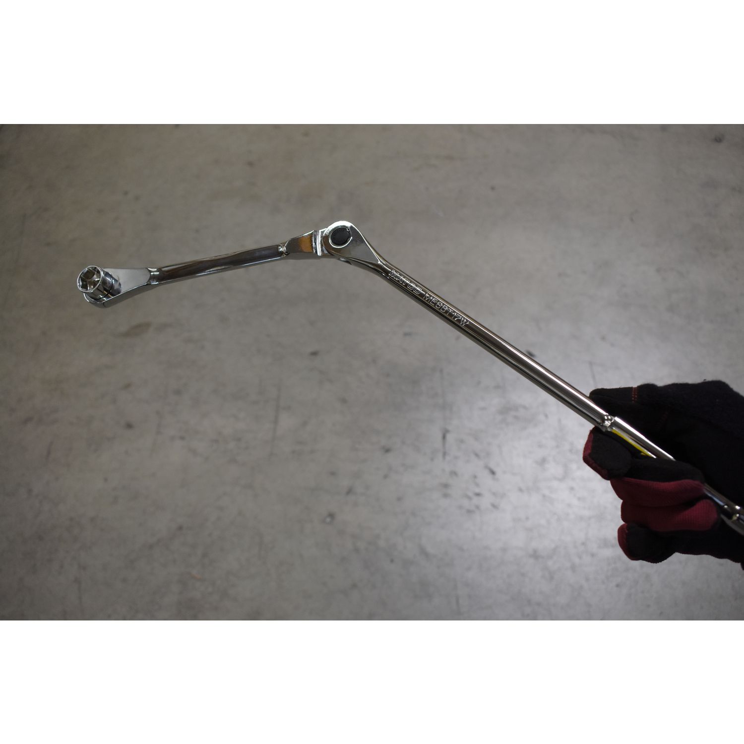 Matco exclusive 100 gear tooth ratcheting wrench features center push button locking angle adjustment for 11 different positions and 210° of access, up to 21-1/4\” in length