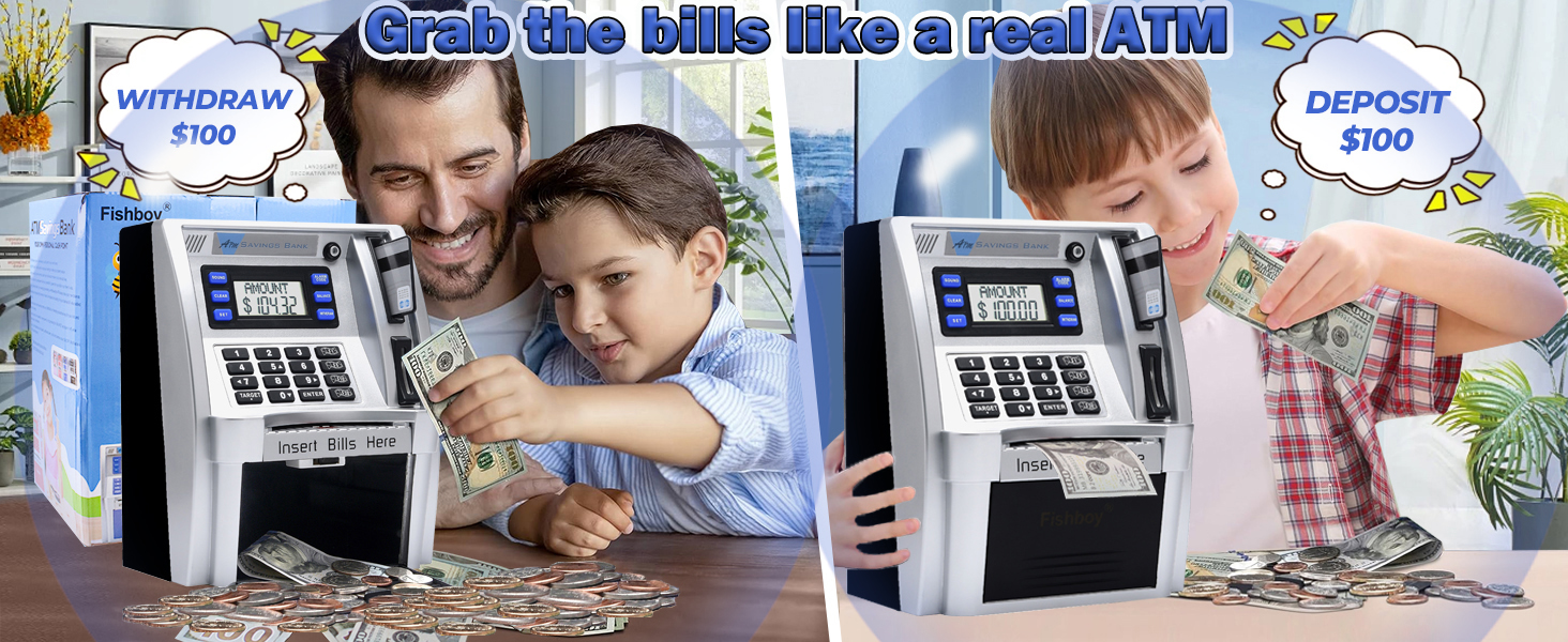 💴🎁Debit Card + 4 Digit PIN Code to Access–It works with real money like a real ATM, the LCD screen lights up and make voice prompts,Making a deposit,watch your savings grow,making a withdrawal,the ATM always show your new balance.