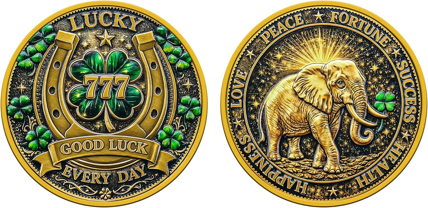 Unique Design:The obverse of the coin shows an uplifted-trunk elephant, symbolizing upward momentum and steady protection; the reverse is carved with a four-leaf clover whose four petals stand for confidence, courage, opportunity, and reward. A 0.3 mm micro-beveled edge lets you scrape lottery coating smoothly without tearing the ticket or leaving residue. Weighing 28 g and 40 mm across, it fits perfectly in the palm—carry it to scratch anytime or display it as a reminder that “luck is in your hand.”
