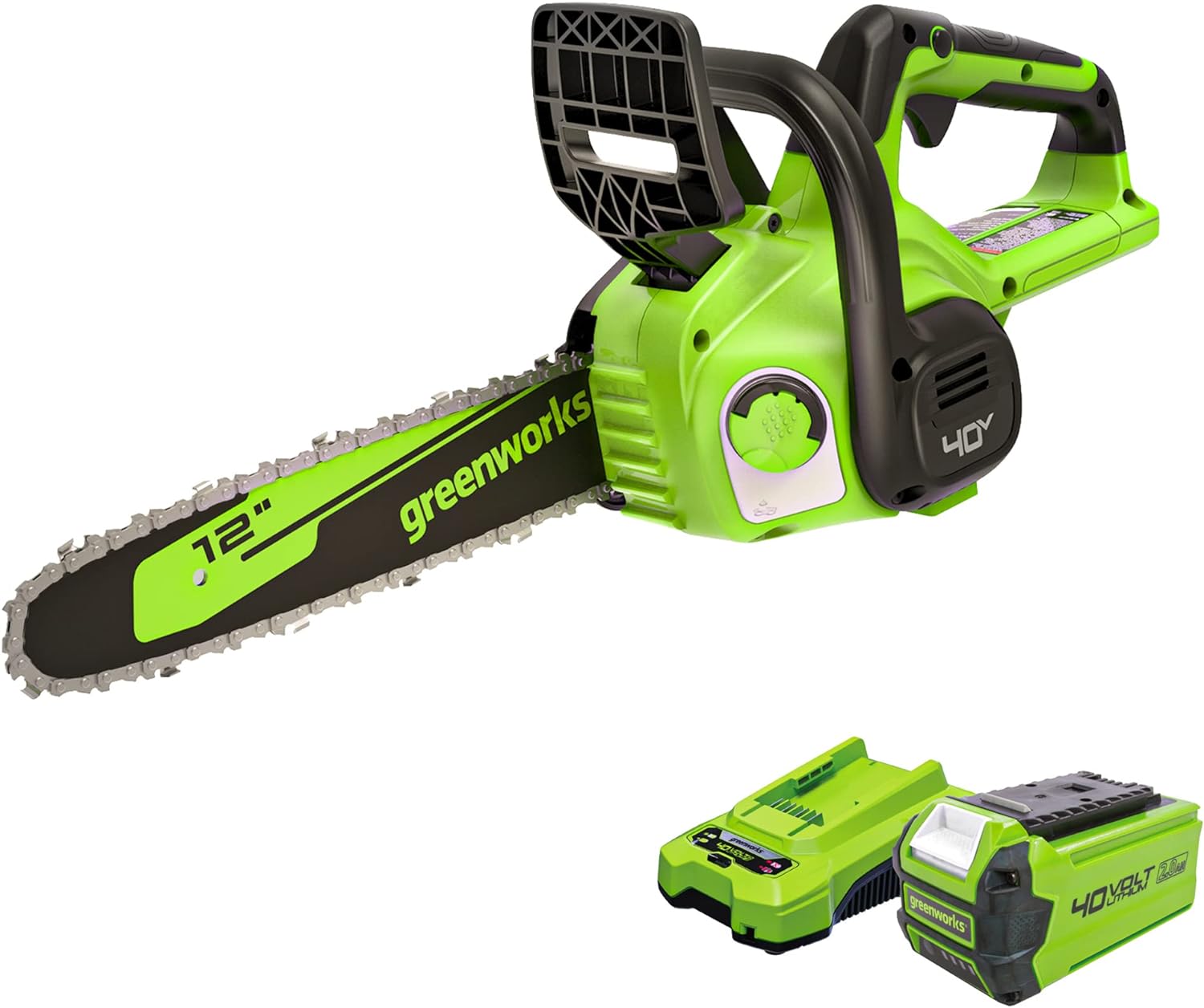 Greenworks 40V 12″ Cordless Compact Chainsaw (Great For Storm Clean-Up, Pruning, and Camping), 2.0Ah Battery and Charger Included