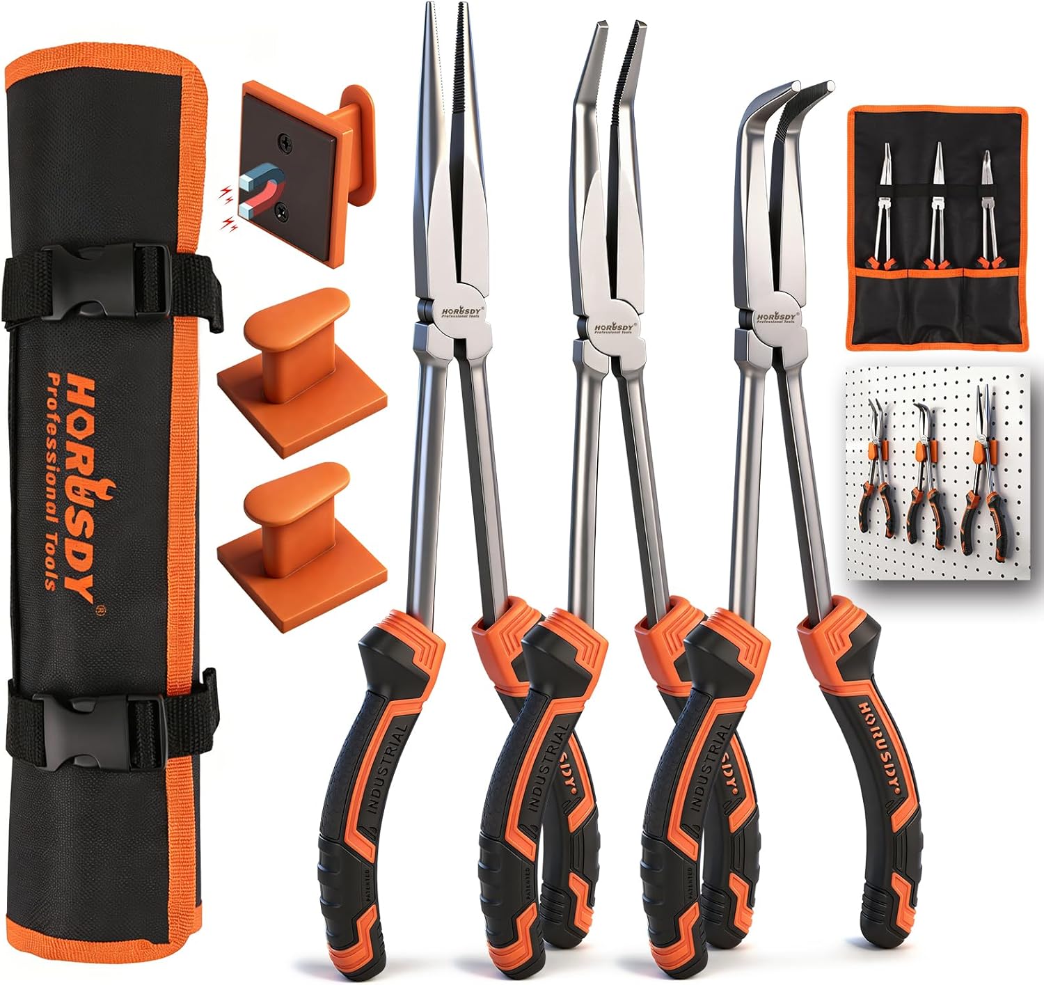 SMART STORAGE – Comes with 3 magnetic plier rack holders for tool organization on metal surfaces and a roll-up storage bag, keeping this pliers tool set organized, portable, and always ready for tight space repairs
