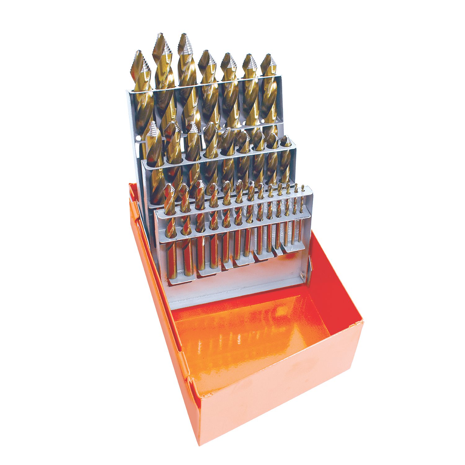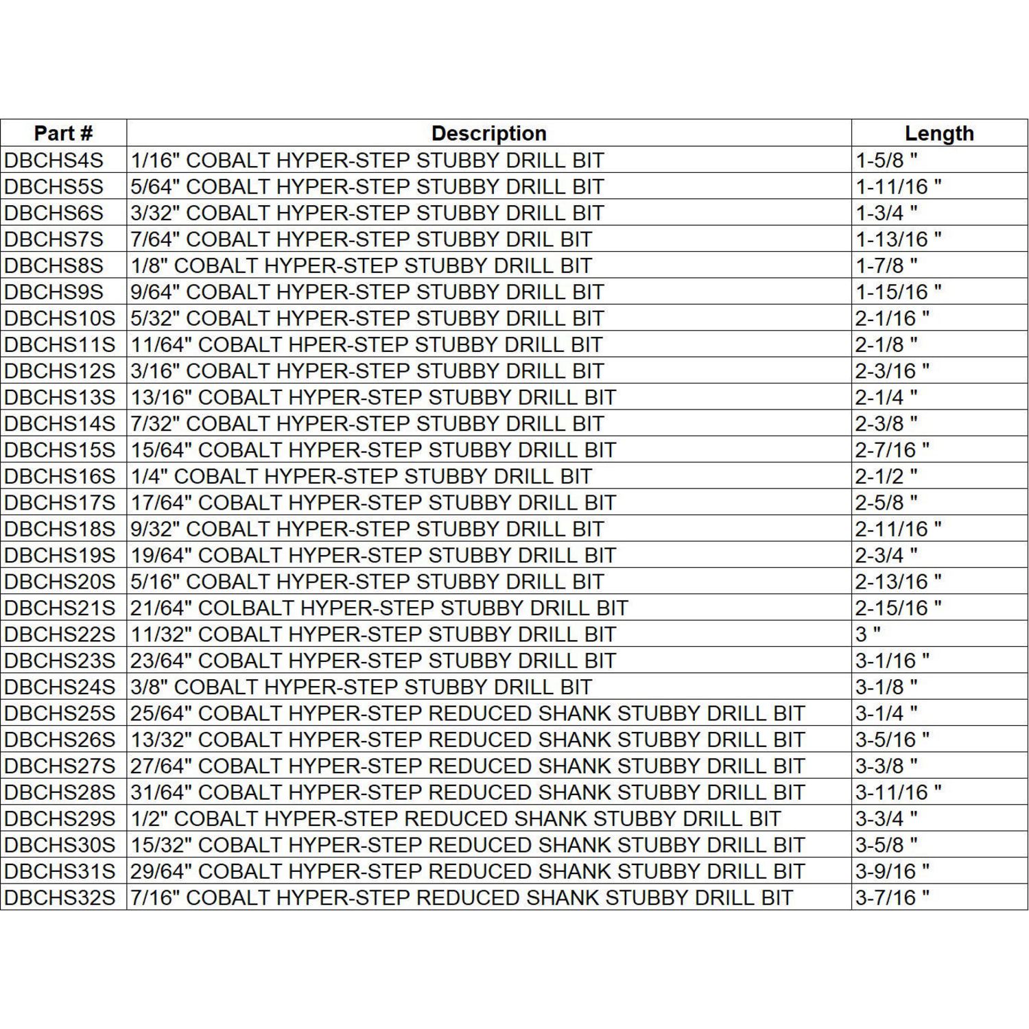 COMPREHENSIVE SET. Contains 1/16\” through 1/2\” by 64ths cobalt stubby length Hyper-Step drill bits