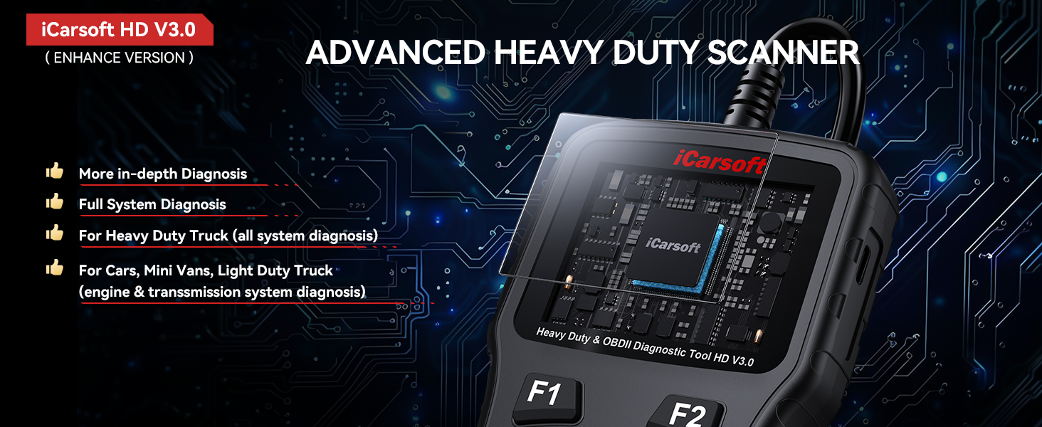 【Extensive Compatibility】2025 Version! All systems diagnostic only for heavy duty truck! iCarsoft HD V3.0 Black heavy duty truck scanner supports all heavy truck truck models with protocols J1939(CAN), J1708(RS485), J1587(RS485), ISO 14230-4, ISO 15764-4, ISO 27145-4 and Euro 6. Come with OBD16-9 adaptor, OBD16 and OBD16-6 adaptor for Freightliner, Kenworth, Cummins, Mack, Volvo, Caterpillar, Western Star, Hino, Isuzu, Detroit, Perkins, Maxxforce, International, Peterbilt, Ford, GM, Chrysler, Class 4-Class 8 trucks, etc.