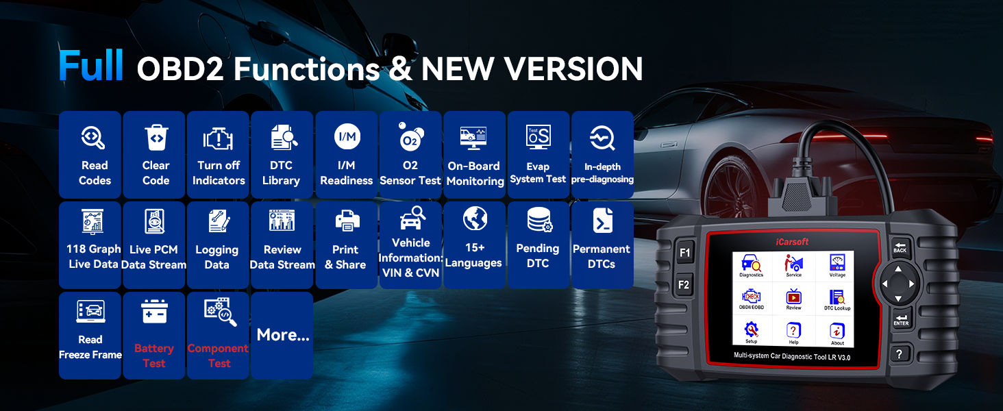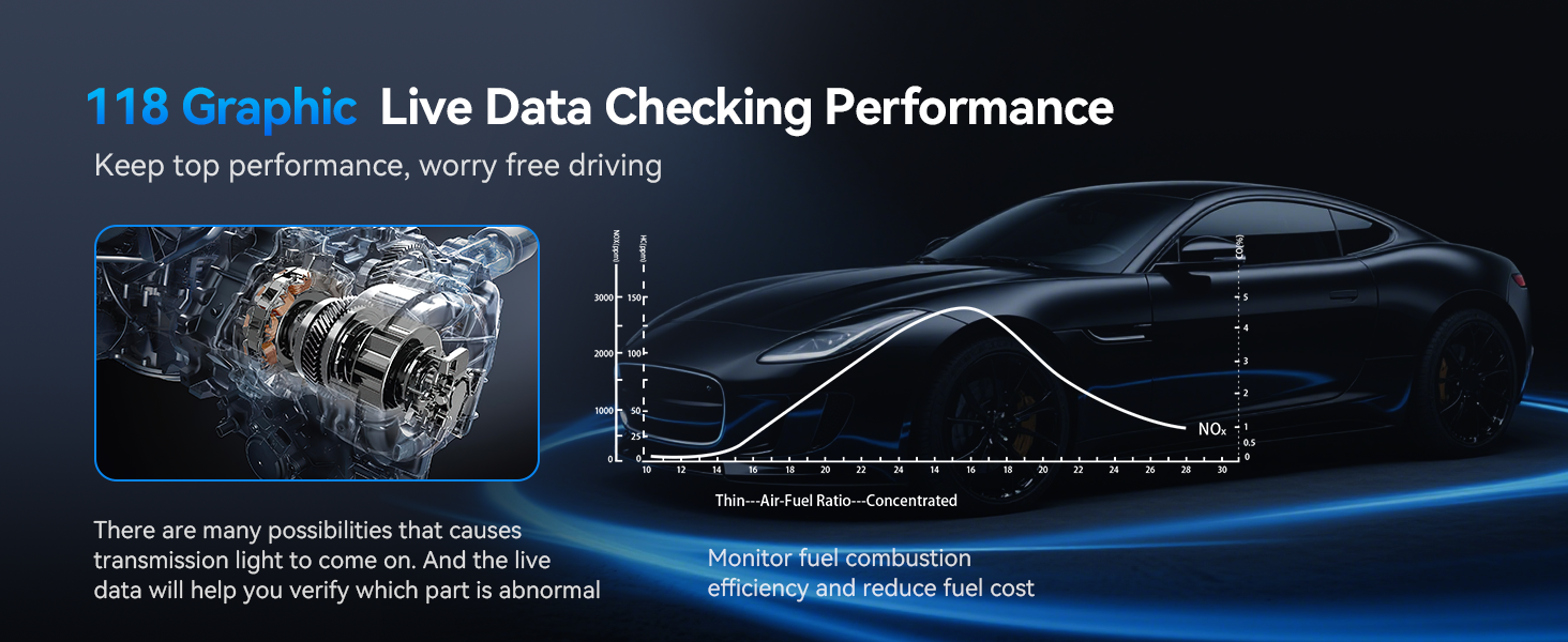 OE-Level OBD2 Functions – With auto diagnosis and VIN detection, this tool quickly reads & clears codes, freeze frames, and tracks 118 live data streams in graphs. Easily turns off MIL. DTC library retrieves generic and manufacturer-specific codes. Key functions: I/M readiness; O2 sensor test; Evap system test; On-board monitoring. Helps understand maintenance needs and pass annual smog checks.