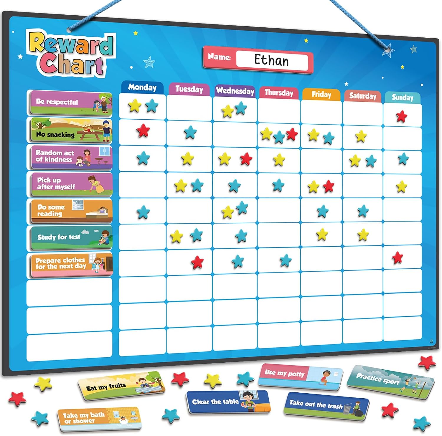 Love it. I was a bit concerned that the magnetic stars and label tags would not stay on the chart but it dies. I liked the pre-made chores that were included. Get ideas and age appropriate. My kids found this chart both fun and exciting. It is super functional as well.p