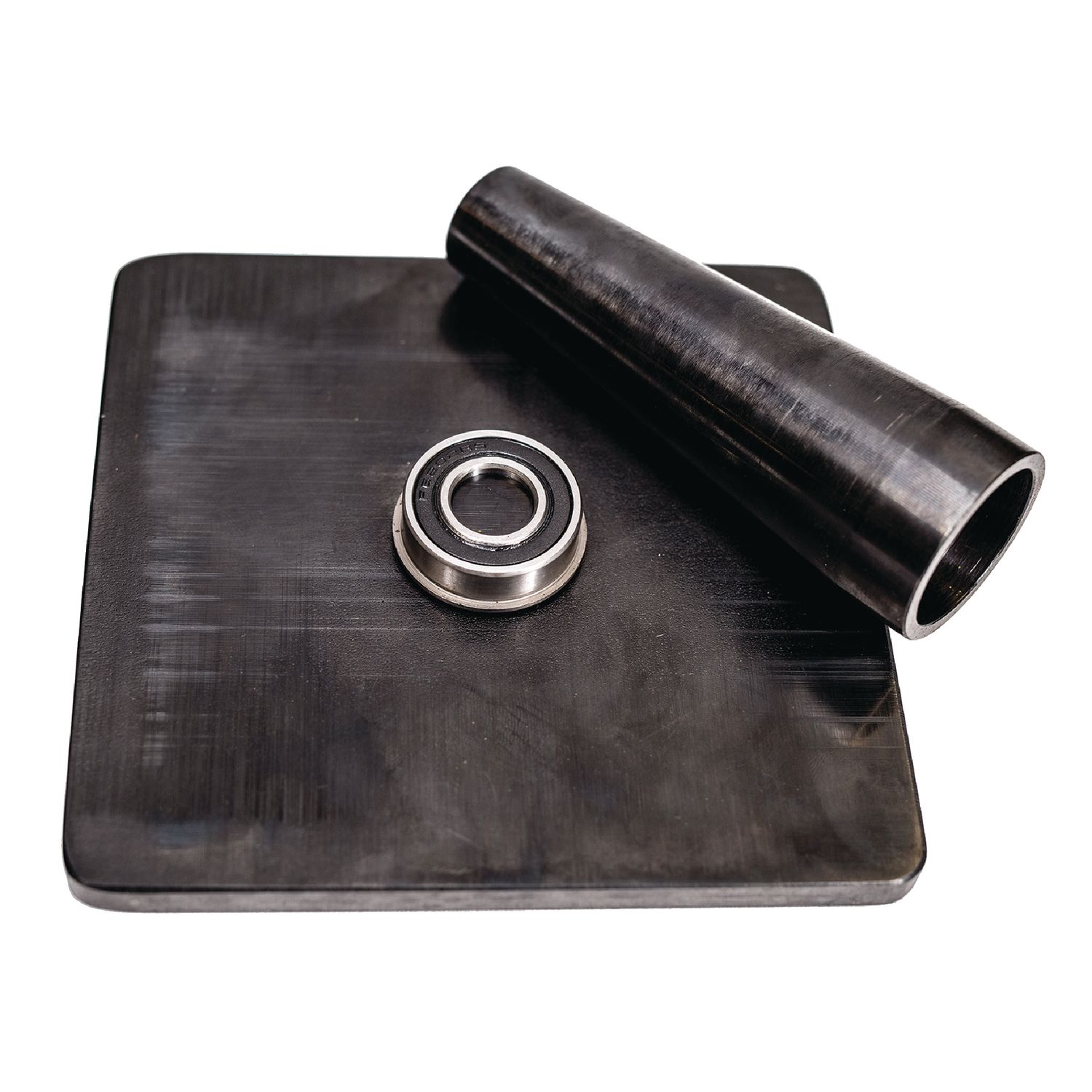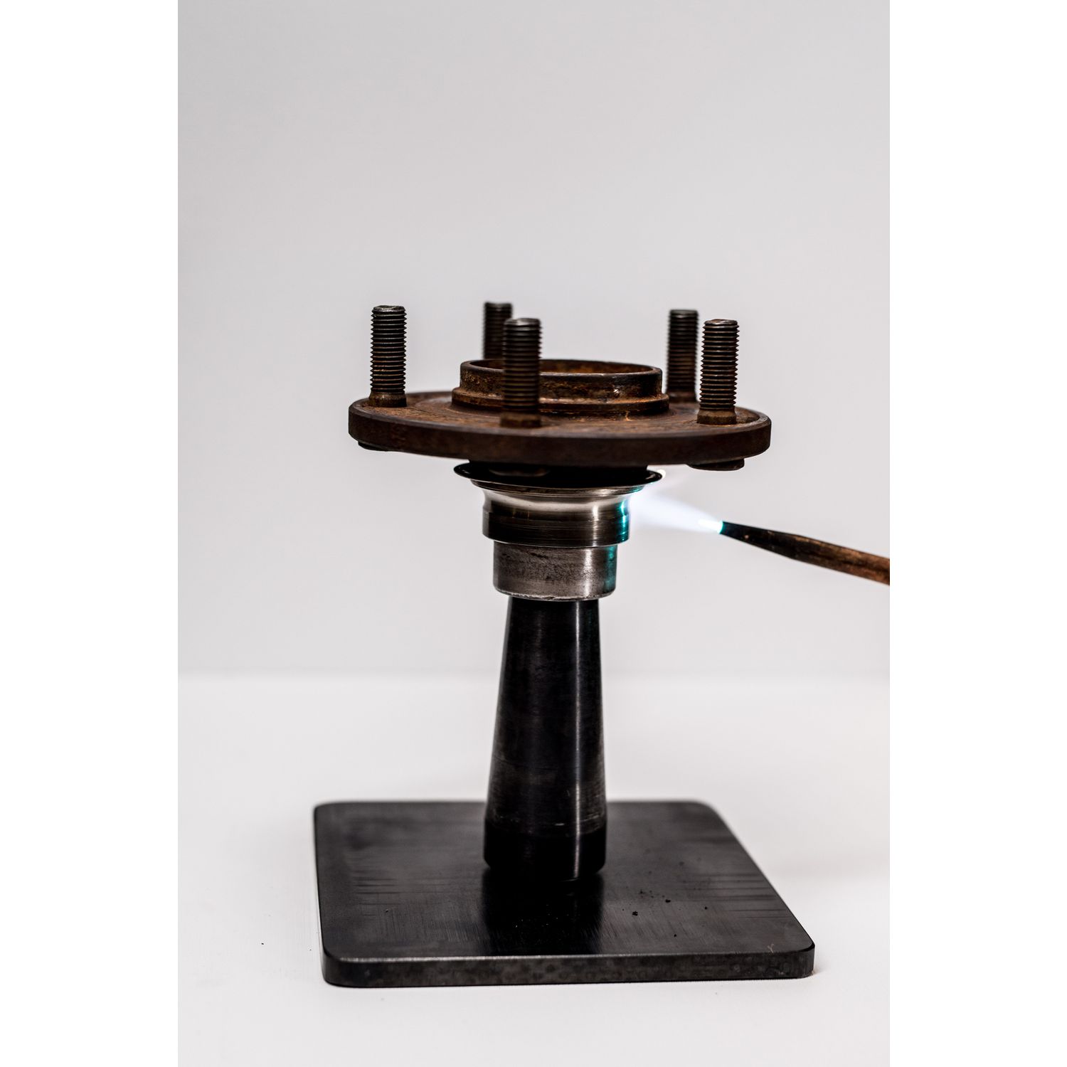 6\” steel cone cylinder with an integrated bearing in its base nesting in an 8.5\” heavy base to allow a technician to place the hub on the tip of the cone to rotate the hub with one hand while applying heat from an oxyacetylene torch