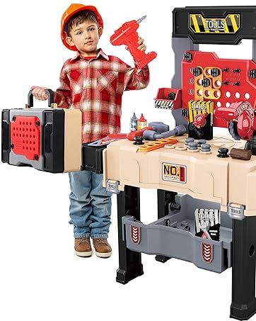Skill-Boosting Play: Sturdy, high-quality workbench with a large storage tray. The tabletop is perfect for pretend cutting and drilling, encouraging imaginative play and skill development