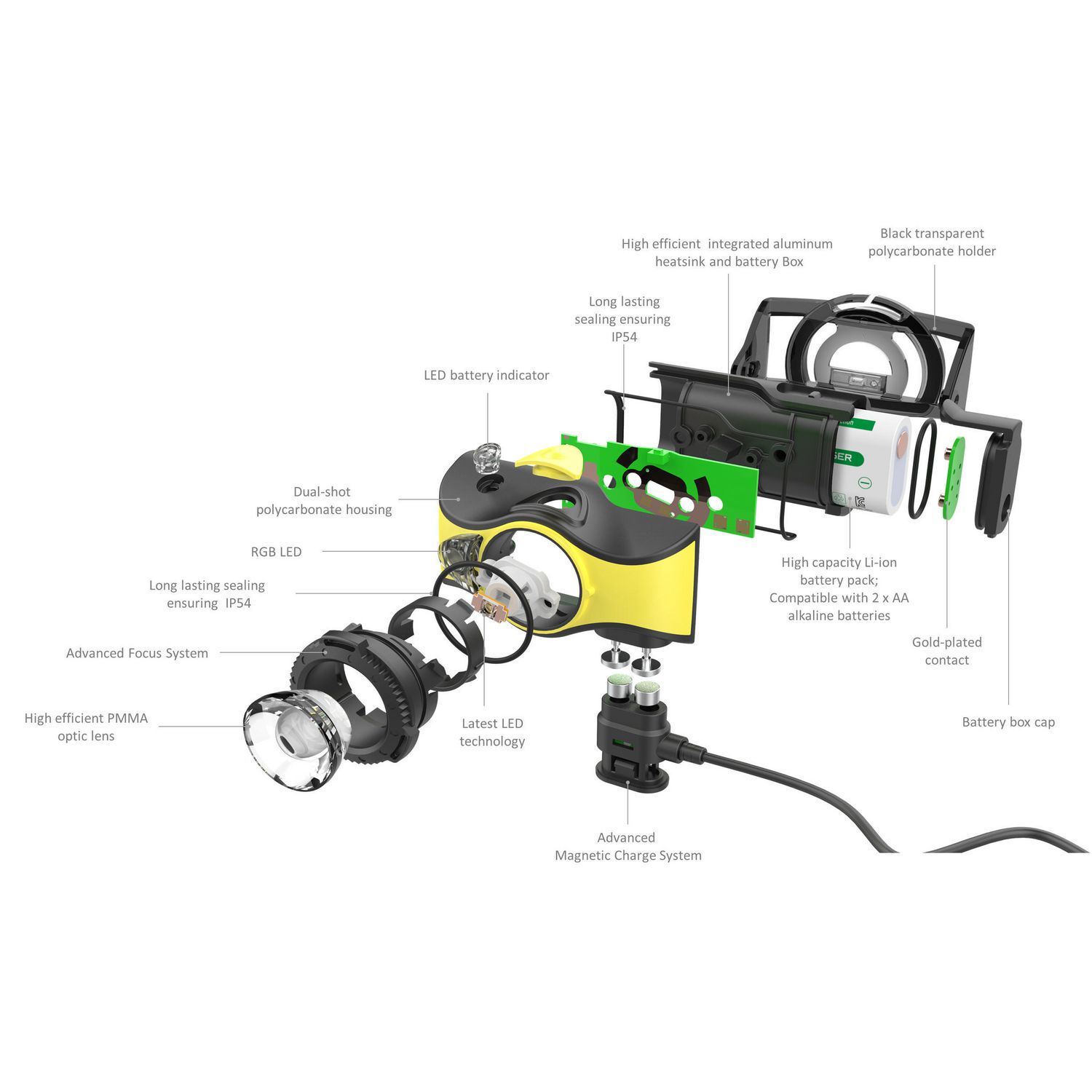 Two types of batteries (Li-Ion and AA) provide the combined benefits of rechargeable and replaceable batteries