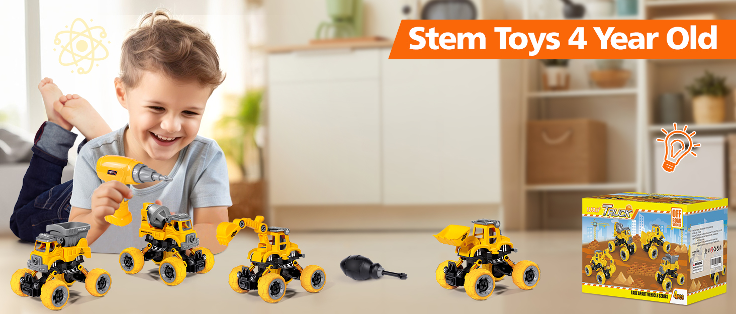 SUPER VALUE TAKE APART TOYS SET: 4-in-1 construction toys for boys, build as Excavator, Bulldozer, Cement Mixer and Dump Truck at one time. Made of premium non-toxic ABS plastic, polished smooth edges, not hurt your littles. Excellent toy trucks meet US toy standard of CPSIA and ASTM, super safe truck toys for 3 4 5 6 7 8 year old boys girls!