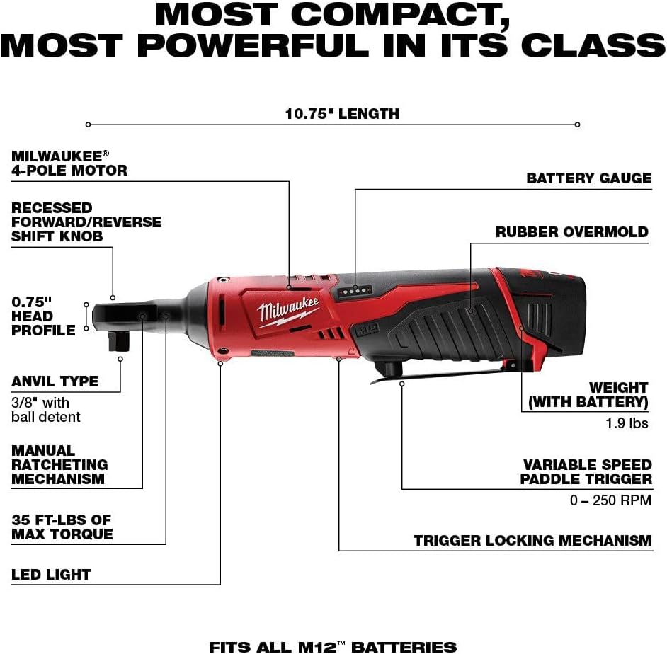 Choose the sub-compact ratchet with best-in-class power, speed and durability. The M12™ Cordless 3/8” Lithium-Ion Ratchet is the ideal tool for auto mechanics, maintenance and repair professionals looking for maximum performance and productivity in a subcompact cordless tool. It utilizes a powerful 12-volt motor to produce up to 35 ft-lbs of torque and 250 RPM, giving users the power and speed of a pneumatic ratchet without the airhose. It’s powered by the M12 REDLITHIUM™ Battery Pack (sold separately), which delivers more work per charge and more work over pack life than the competitors, as well as best-in-class performance in extreme jobsite conditions. At just 10-3/4” long and 1.9 lbs, the ratchet is tool-belt portable, and features a 3/4″ low-profile head design for work in the tightest of spaces and engine bays. The variable-speed metal trigger and reinforced steel housing provide maximum control and durability with any application.
