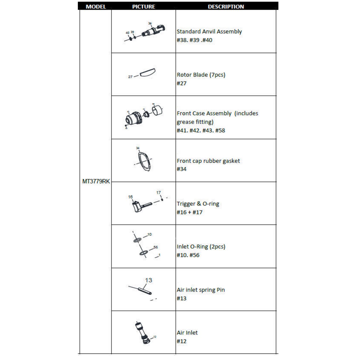 Includes anvil assembly, rotor blade, front case assembly with grease fitting, front cap rubber gasket, trigger and O-ring, inlet o-ring, air inlet spring pin and air inlet