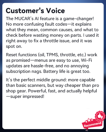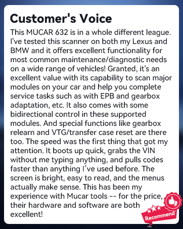 I’ve been using the MUCAR 632 for a few weeks now and it honestly feels like having a mini mechanic at home.The AI explanations and bidirectional controls are super helpful, especially for clearing codes and doing resets without guessing.The screen is clear and fast, and I love that updates are lifetime with no subscription.That said, it’s definitely more complex than a basic OBD2 reader, so there’s a bit of a learning curve if you’re new.Compatibility can also be hit or miss depending on the car, so checking beforehand is important.Overall, pricey but worth it if you like doing proper DIY diagnostics instead of just reading codes.