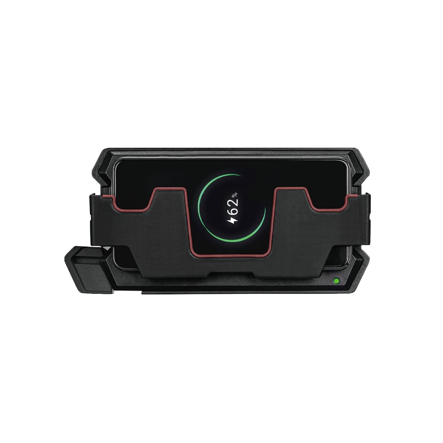 Pull lever to deploy the smart phone cradle to secure and charge most modern smart phones even through many phone covers