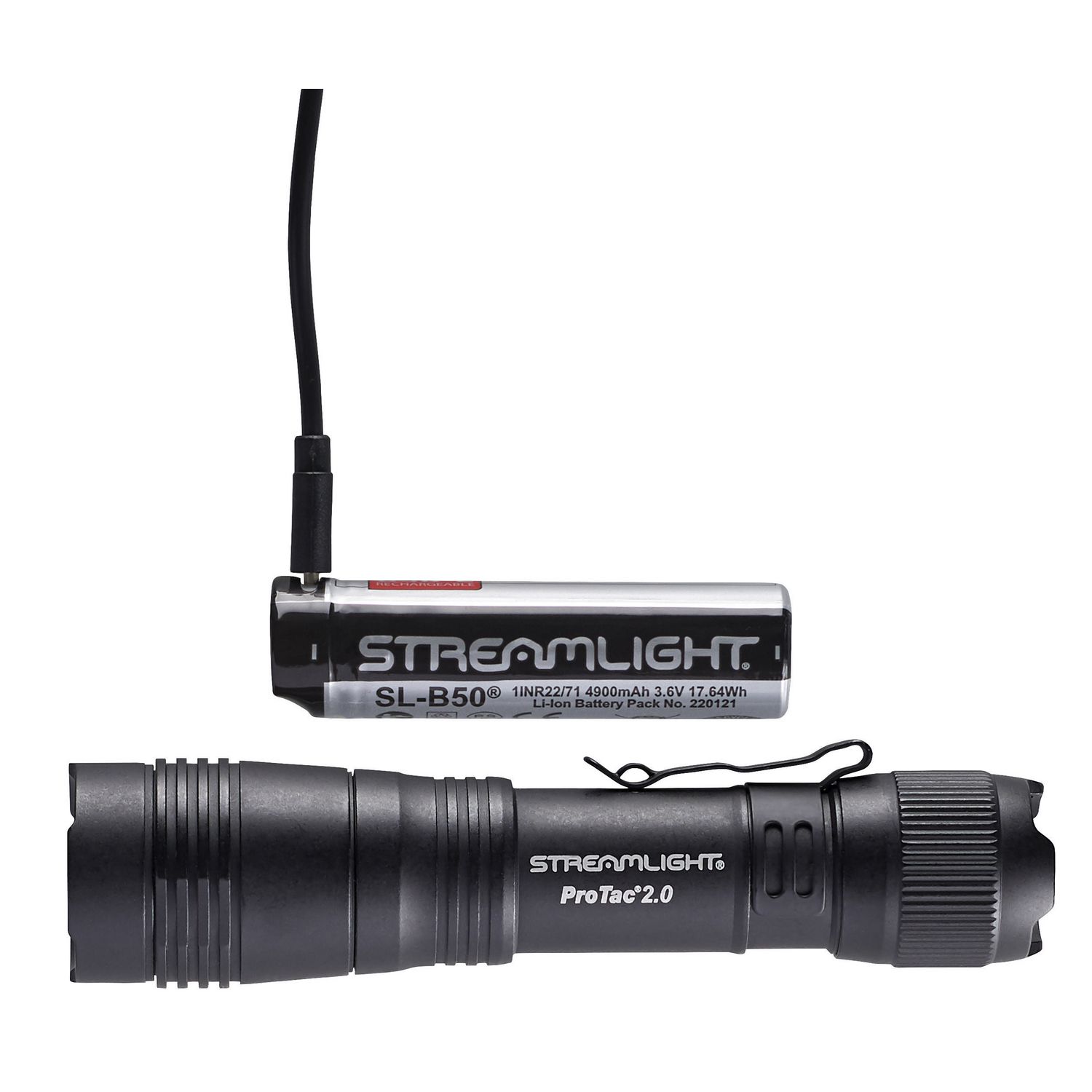 EASILY RECHARGEABLE. Uses Streamlight SL-B50 protected 4,900mAh Li-Ion USB rechargeable battery pack which can be charged inside or outside of the light