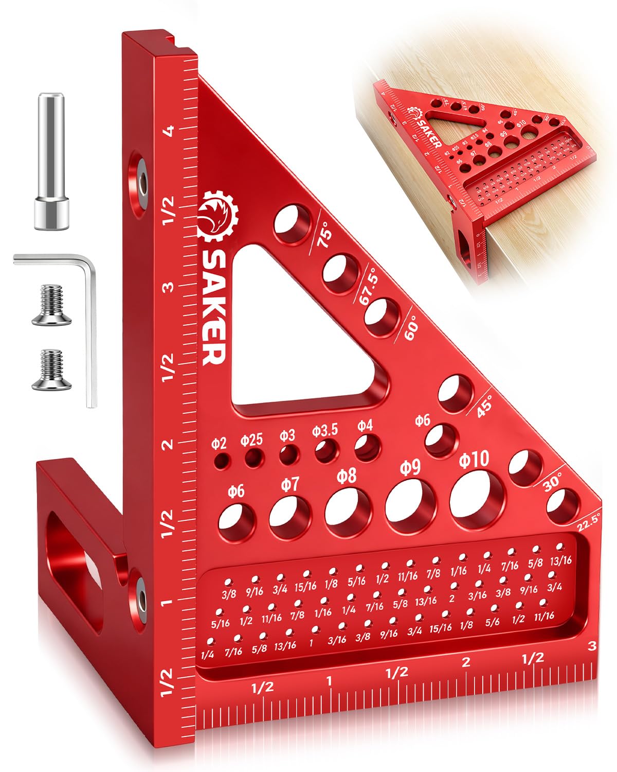 Multi-Functional Square: This Saker carpenter tool combines the roles of a rafter and triangle ruler, integrating measuring, marking, calibration, and drill bit sizing in one tool. It supports precise 0–90° layouts and accurate drill bit sizing for clean, consistent results in woodworking and construction tasks.